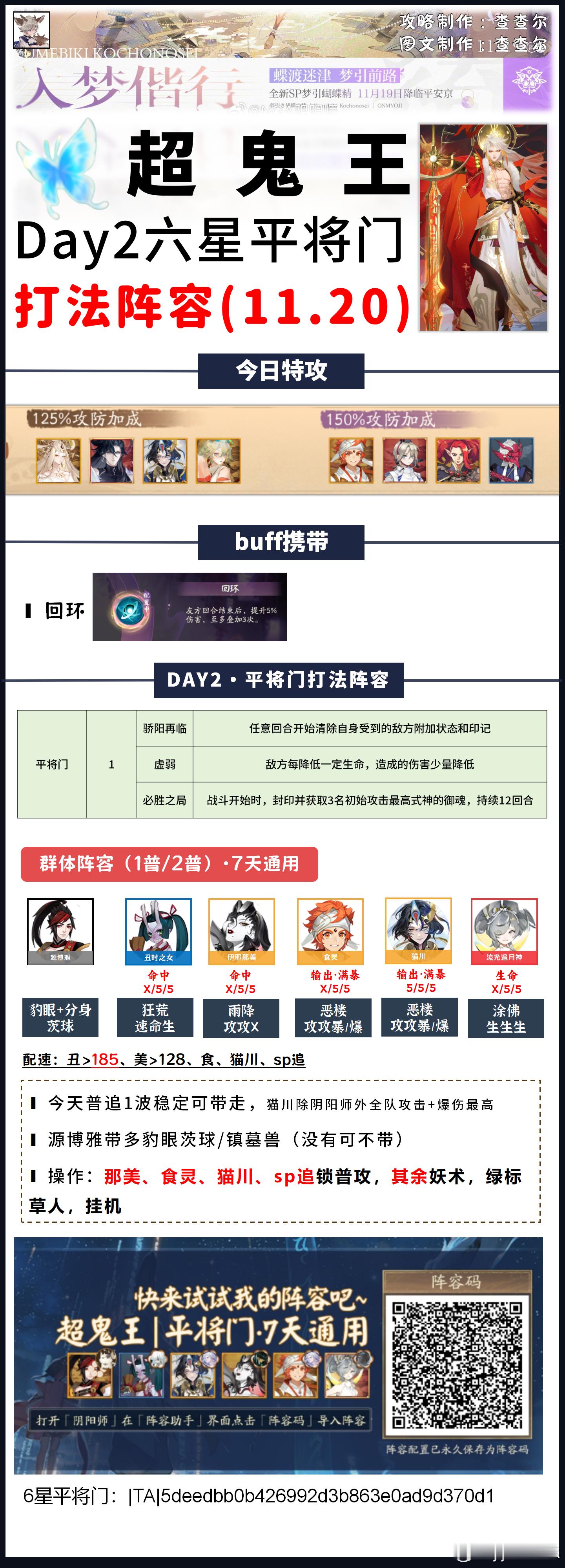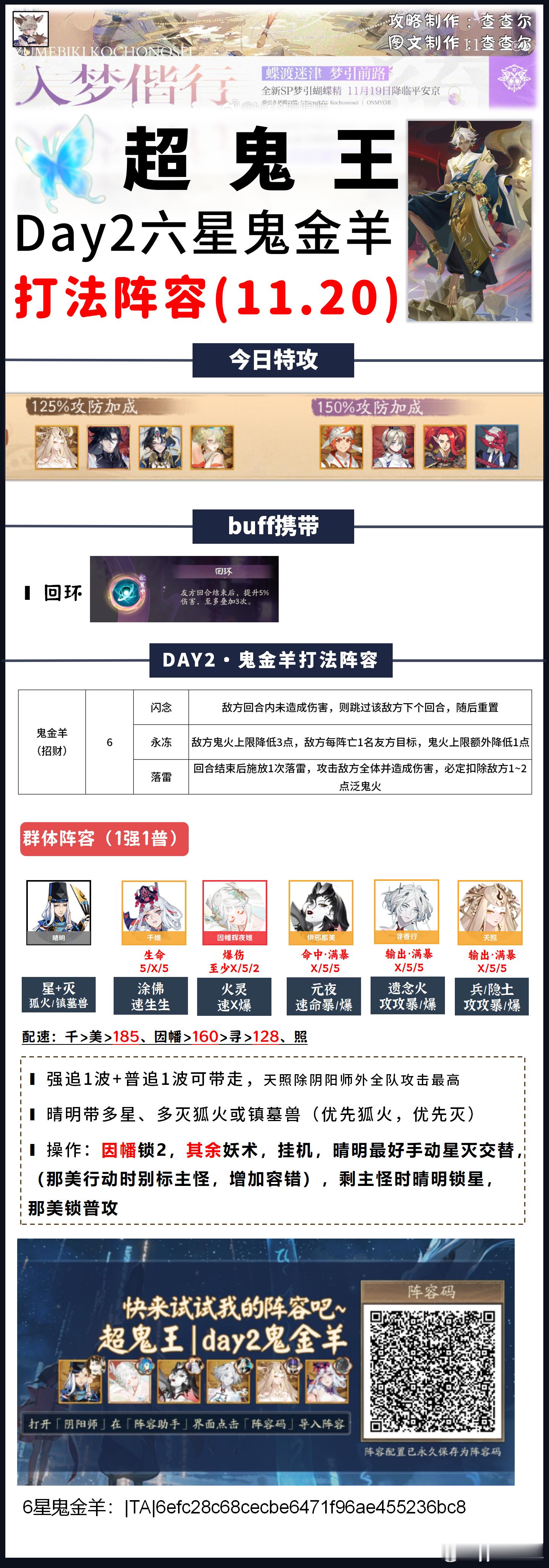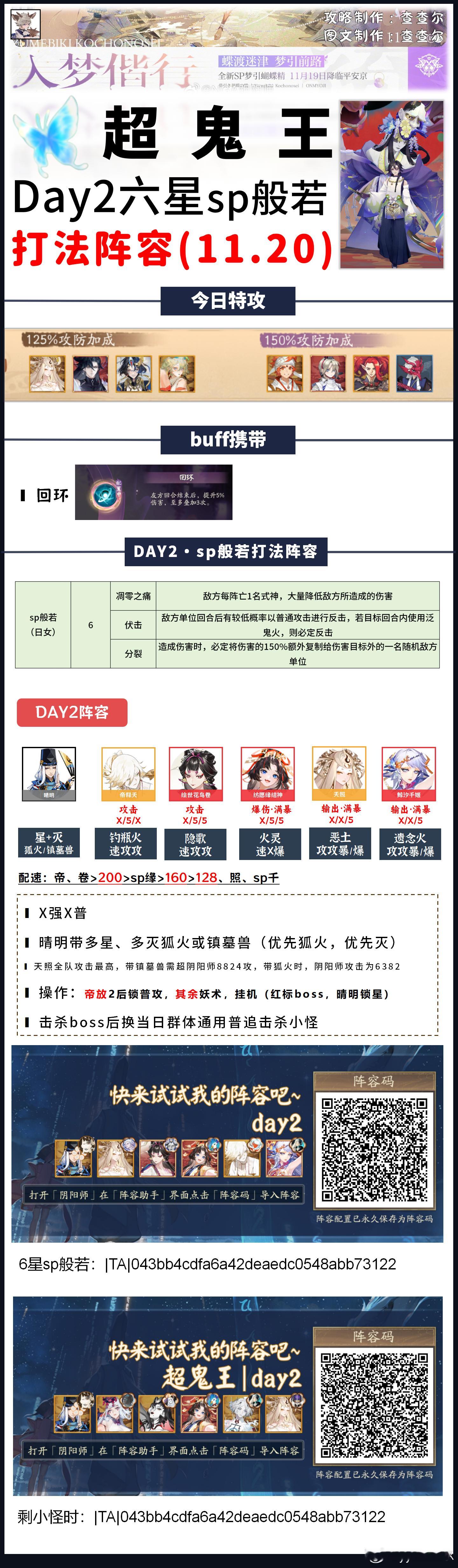 【超鬼王】Day2全鬼王阵容+阵容码一键配请看完简介,含门票刷取推荐+契灵推荐■图一:1~4星通用打法(含7天通用)■图二:5星day2打法■图三~图十二:6星打法■门票获取:①单局耗体越多,门票掉率越高②单局魂王(神罚)掉率最高(掉率最高)③组队觉醒最省体力(最省体)④用5倍券刷契灵·探查是目前最快刷完每日鬼王票的办法(最快速刷)每日门票情况:■每日免费得54张门票,商店每日可花150勾买5张■6星掉率很随机,但基本每天稳定在1~5张之间(5张极少,1~2张是常态)■7天花勾不氪只打满自己的鬼王大概率不超2000w积分■7天花勾+氪花合战+打满自己鬼王大概率不超3300w积分契灵■本次可用到狐火契灵,3灭3星,优先灭(3灭0星也能用)狐火的好处是增加了阴阳师命中但没增加阴阳师攻击,所以输出式神超其它式神即可,阴阳师攻击仅为6382■镇墓兽3星3灭没被淘汰,之前怎么用,这次还怎么用。我没刷到3灭狐火,所以我一直带着镇墓兽打的■3豹眼茨球可以用来打6星平将门,没有可以用3豹眼镇墓兽替换,或者不带契灵也行(最多2普,肯定能带走)关于阵容:阵容可能会有优化,尤其sp般若阵容,看看明天能不能测到更好的阵容了…黑名单中的黑名单因超鬼王工作量巨大,如有配置失误还请大家多多包涵,感谢大家支持(有配错的我及时更正)