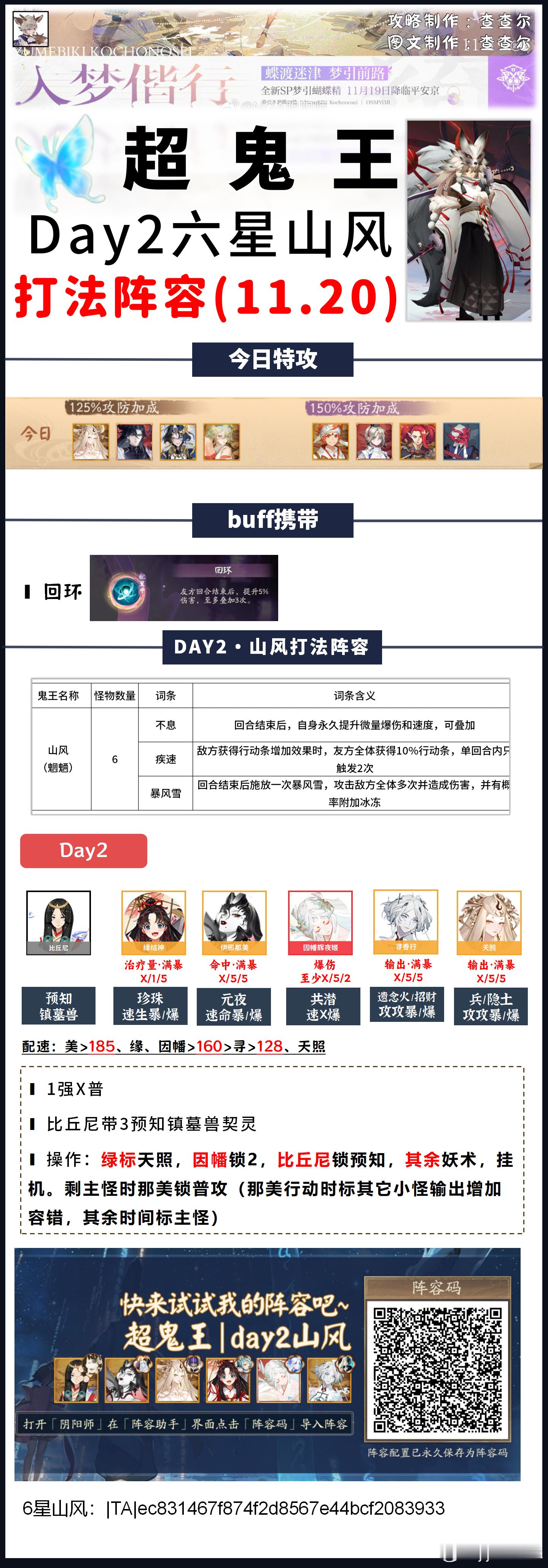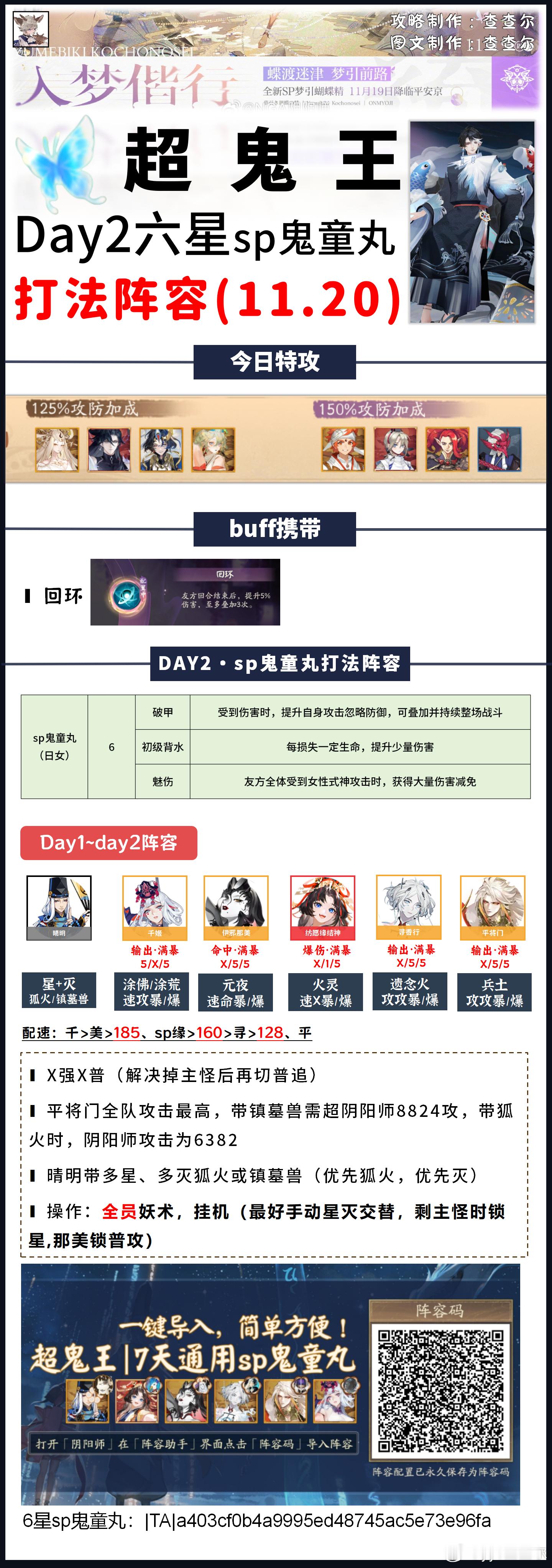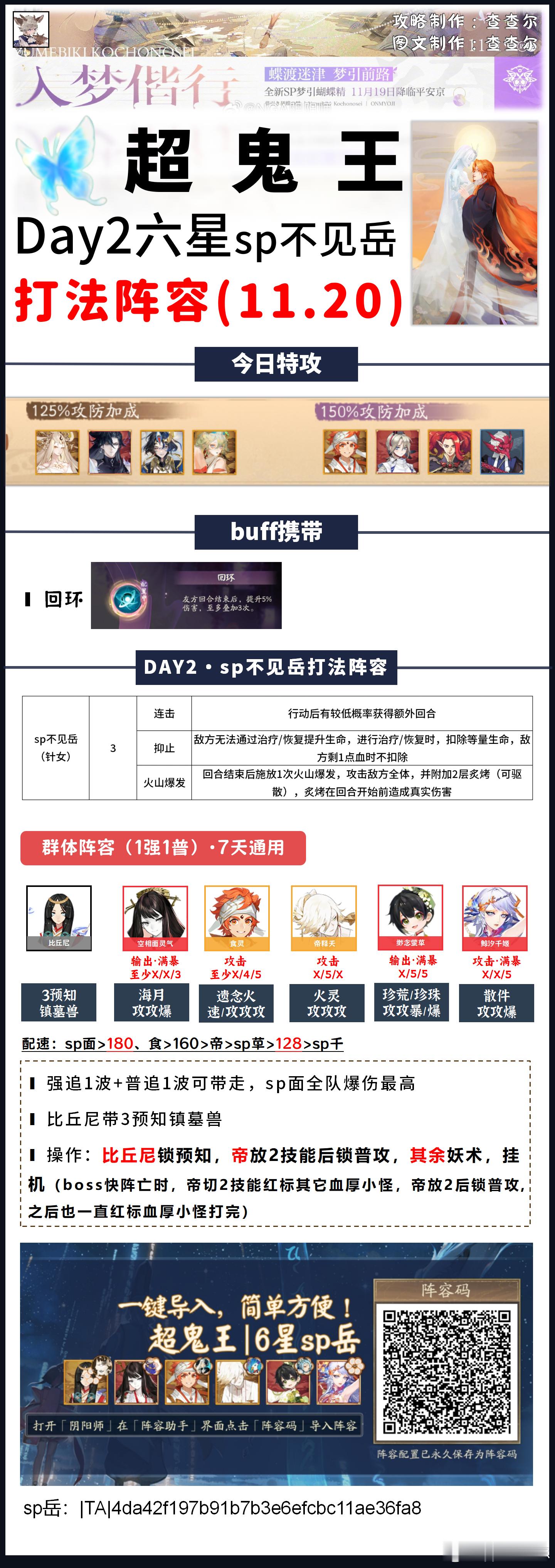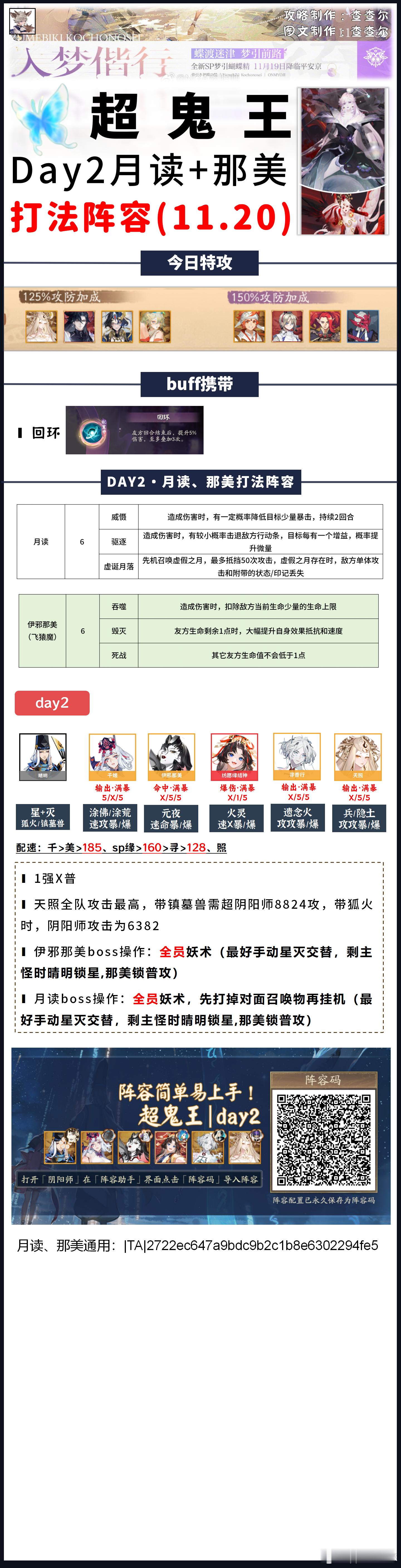 【超鬼王】Day2全鬼王阵容+阵容码一键配请看完简介,含门票刷取推荐+契灵推荐■图一:1~4星通用打法(含7天通用)■图二:5星day2打法■图三~图十二:6星打法■门票获取:①单局耗体越多,门票掉率越高②单局魂王(神罚)掉率最高(掉率最高)③组队觉醒最省体力(最省体)④用5倍券刷契灵·探查是目前最快刷完每日鬼王票的办法(最快速刷)每日门票情况:■每日免费得54张门票,商店每日可花150勾买5张■6星掉率很随机,但基本每天稳定在1~5张之间(5张极少,1~2张是常态)■7天花勾不氪只打满自己的鬼王大概率不超2000w积分■7天花勾+氪花合战+打满自己鬼王大概率不超3300w积分契灵■本次可用到狐火契灵,3灭3星,优先灭(3灭0星也能用)狐火的好处是增加了阴阳师命中但没增加阴阳师攻击,所以输出式神超其它式神即可,阴阳师攻击仅为6382■镇墓兽3星3灭没被淘汰,之前怎么用,这次还怎么用。我没刷到3灭狐火,所以我一直带着镇墓兽打的■3豹眼茨球可以用来打6星平将门,没有可以用3豹眼镇墓兽替换,或者不带契灵也行(最多2普,肯定能带走)关于阵容:阵容可能会有优化,尤其sp般若阵容,看看明天能不能测到更好的阵容了…黑名单中的黑名单因超鬼王工作量巨大,如有配置失误还请大家多多包涵,感谢大家支持(有配错的我及时更正)