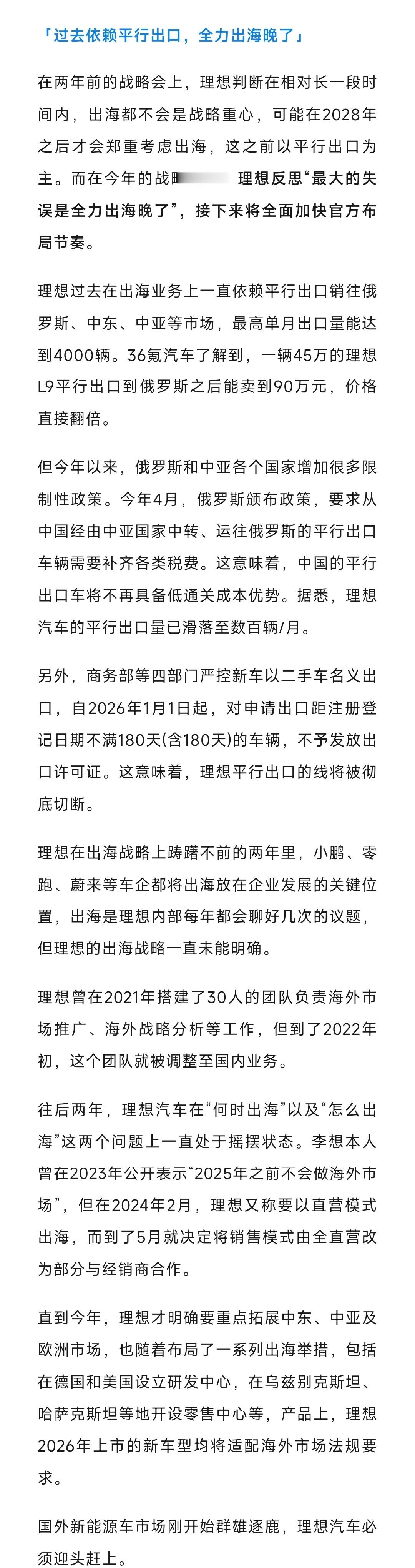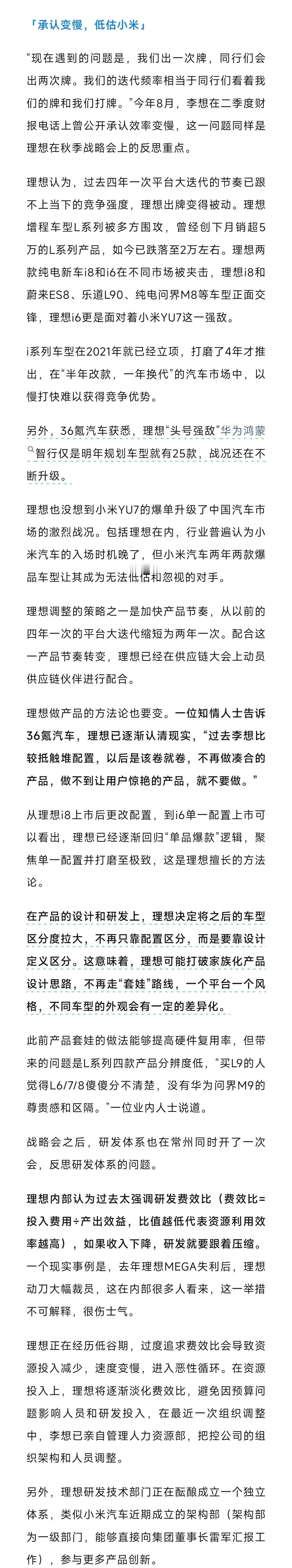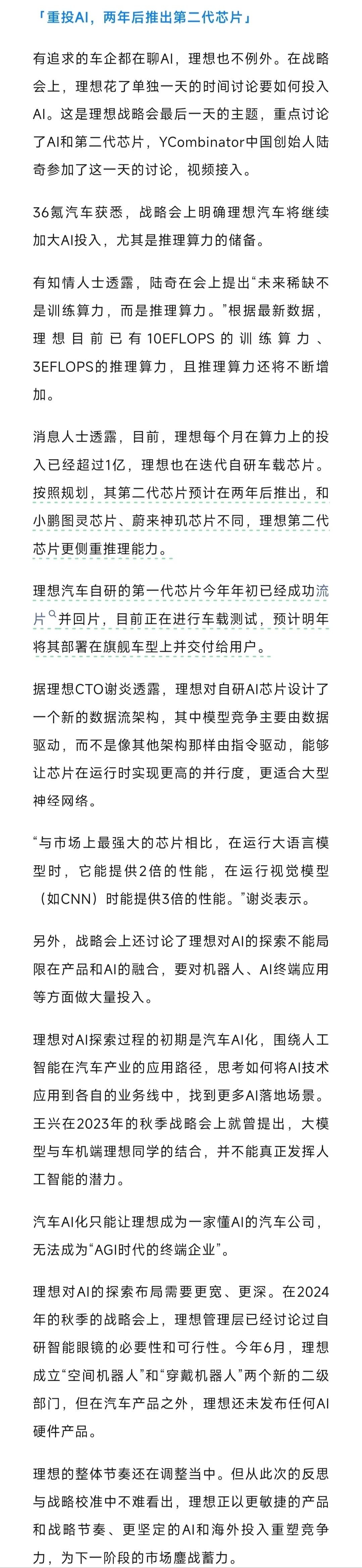 来自36氪的报道,理想在10月战略会上终于在进行了一场大型社会试错实验之后,推翻了过去的很多错误选择!全力出海,加重投入ai,放弃过度追求费效比!接下来就看能做成如何了!图三里面过度追求费效比的事可算是确定是错误了,这玩意真是过去理想很多莫名问题的根源。