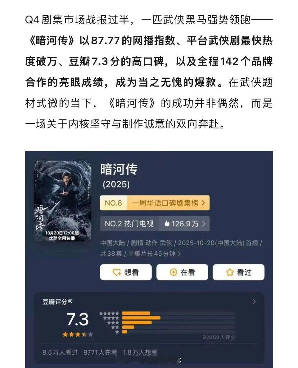 V榜认证龚俊《暗河传》成为Q4剧集当之无愧的爆款