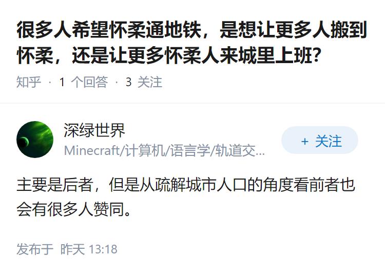很多人希望怀柔通地铁,是想让更多人搬到怀柔,还是让更多怀柔人来城里上班?
