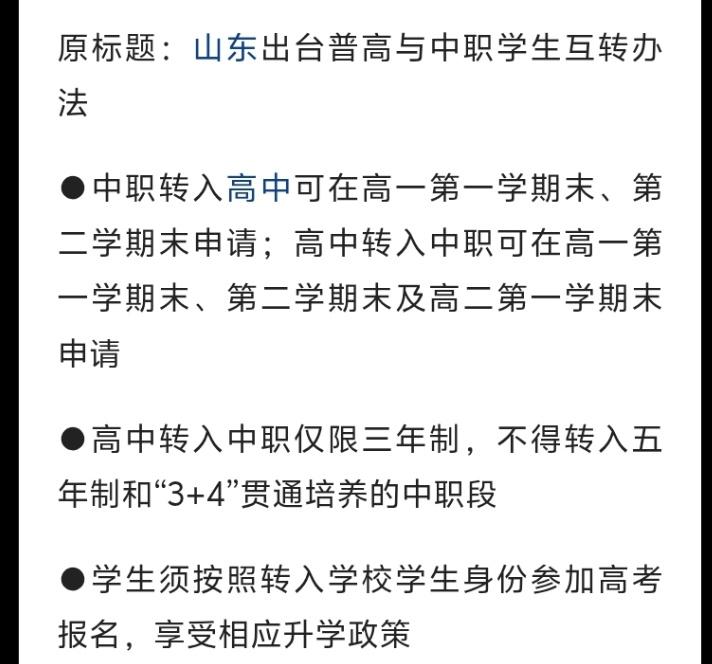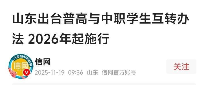 山东教育大变革重磅发布引爆全网!2026年起高中生与职校生可互转,家长沸腾:终于不用一考定终身了! (来源:综合自山东省教育厅、大众新闻客户端、信网等官方发布) 那个曾经让无数家庭纠结万分的选择题——读高中还是上职校,如今在山东迎来了历史性转折。当省教育厅正式印发《普通高中和中等职业学校学生互转实施办法》的消息传出,许多家长的第一反应是:这是真的吗?孩子的人生路径,终于不再是单行道了! 这一政策之所以引发如此强烈的社会共鸣,是因为它精准击中了当前教育体系中最令人焦虑的痛点。过去,中考仿佛一场“生死决战”,一纸成绩单就将孩子们划入两条截然不同的轨道。普通高中与中职学校之间那堵看不见的墙,不知阻隔了多少孩子的梦想。如今,这堵墙终于要被打破了。 从2026年1月1日起,山东的普通高中和中职学校将开启双向流动通道。这意味着,正在读高中的学生如果发现自己更适合技能型学习,可以在高一、高二关键节点转入中职;而中职学子若在文化课学习上展现潜力,也有机会转入普通高中。教育的选择权,第一次真正交还到了学生手中。 细读政策条文,你会发现设计者的良苦用心。转学时间设置得科学合理:中职转高中安排在高一学期末,给足适应期;高中转中职则放宽到高二学期末,让学生有充分时间认清自己的发展方向。这种人性化的设计,避免了过去“一失足成千古恨”的教育悲剧。 更让人振奋的是,这套制度并非简单的“开门放行”,而是配套了完整的保障体系。学分互认遵循“相同直认、相近可认”原则,各市还将制定详细的课程目录与学分换算指南。这意味着,学生转学后不必从头再来,之前的学习成果都能得到尊重和认可。 对于家长最关心的升学问题,政策也给出了明确答案:学生按照转入学校的身份参加高考,享受相应升学政策。这就彻底打消了“转学会不会影响考大学”的顾虑。从中职转入高中的学生,同样可以冲刺心仪的本科院校;而从高中转入中职的学生,则能在职教高考中发挥技能优势。 这项改革的深远意义,远不止于解决个别学生的转学需求。它标志着我们的教育理念正在发生根本性转变——从筛选分流走向因材施教,从单一标准走向多元评价。当一个社会能够为不同特质的孩子提供适合的成长路径时,这个社会才真正走向成熟。 在互转的具体实施上,政策同样考虑周全。各市将采取“一对一”“一对多”等形式确定互转学校,原则上在县域内进行,确保教育资源合理配置。考核机制以中考成绩和平时成绩为基础,鼓励市级统筹命题,最大限度保证公平公正。 那些正在中职学校发奋苦读的孩子,听到这个消息时眼中闪动的光芒,或许是对这项政策最好的注解。一位职校老师动情地说:“我的学生里不乏聪明好学的孩子,只是中考时发挥失常。现在他们看到了新的希望,学习的劲头更足了。” 而对于在普通高中感到不适应的学生来说,这同样是重大利好。有些孩子动手能力强,理论学习却相当吃力,如今他们可以勇敢地选择更适合的技能之路,不必在题海中苦苦挣扎。这种转向不是失败,而是通往成功的另一条捷径。 教育专家指出,山东此举在全国具有示范意义。当其他地区还在为普职分流争论不休时,山东已经用制度创新给出了解决方案。这种双向流动的机制,既尊重了学生的自主选择,又保障了教育质量,可谓多方共赢。 随着2026年实施日期的临近,各地学校正在紧锣密鼓地制定实施细则。这场教育变革的序幕刚刚拉开,但它所传递的信号已经足够清晰:每个孩子都是独特的,教育应该为这种独特性提供成长空间,而不是用统一的标准去修剪个性的枝丫。 当教育回归其本质,当选择权回到个人手中,我们有理由相信,会有更多孩子找到属于自己的精彩人生。这不仅是山东教育的突破,更是整个教育理念的进步。让我们期待2026年的到来,期待每一个孩子都能在适合自己的道路上绽放光芒! 山东身边事