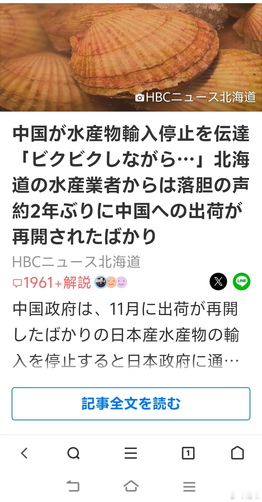 其实中国的理由是日本没有提供足够的文件。北海道出口扇贝的这刚刚11月初申请,结果就碰上了高市有事。新闻中这位原来每年向中国出口200吨扇贝海产的社长说,“我们必须战战兢兢地做。就算重新开始,马上又会变成这样了。”