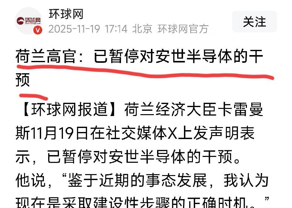荷兰那边竟突然变卦了!前些天还宣称要组团来我国商谈安世半导体之事,今儿个其经济大臣便在社交平台宣告——暂停对安世半导体的干预了!这转变速度比我家楼下煎饼摊翻饼还快,究竟是怎么回事呢? 咱们先来梳理一下前因后果。11月13日,荷兰经济大臣卡雷曼斯曾放话,称下周初(即18号前后)要带人来中国,商讨安世半导体的问题。当时我国商务部也作出了回应,态度十分坦诚:我国始终负责任地维护全球半导体产业链的稳定,也与荷方进行过几轮磋商,欢迎他们前来,但需带着诚意,拿出切实的解决办法,从根本上稳住产业链供应链安全。 谁能料到,才过了不到一周,对方就改口“暂停干预”了。卡雷曼斯在X上表示:“鉴于近期事态的发展,认为当下应采取建设性的举措。”这话听起来有些玄妙,咱们也别胡乱猜测,反正荷兰方面松口了,总归不是坏事。 要说这安世半导体,可是闻泰科技旗下的“宝贝”,荷兰政府此前为何要插手呢?明眼人都清楚,半导体行业如今极为重要,谁都想掌握些话语权。但我国的态度向来明确:涉及核心利益,绝无商量的余地!正如网友所说,“恢复中方人员管理权、开除外方高管、荷方需保证不再捣乱、产品全部用人民币结算”——若这四条无法达成,那怎能算得上“解决”? 好在我国底气十足!这些年,我国半导体产业自身积累了不少实力,从设计到制造,产业链愈发稳固。荷兰此时改变主意,说不定也是想明白了:与我国硬刚没有好处,合作共赢才是正途。 有人或许会认为,“暂停干预”是不是就万事大吉了?我看呐,远未到放松的时候。这件事给我们提了个醒:核心技术掌握在自己手中才是关键,国际合作要讲求平等,不能任由他人欺压。再者,我国市场如此庞大,企业能力也不逊色,即便外部存在干扰,只要自身把基础打牢,谁也奈何不了我们! 最后想问问大家:您觉得荷兰此次“暂停干预”,是真心想要谈判,还是缓兵之计?倘若您是企业负责人,会如何与外方商谈条件?欢迎在评论区交流! 信息来源:环球网2025年11月19日报道《荷兰高官:已暂停对安世半导体的干预》安世半导体公司 荷兰芯片战略 荷兰芯片困局 荷兰安世半导体 荷兰安世事件 荷兰供应链 荷兰芯片谈判