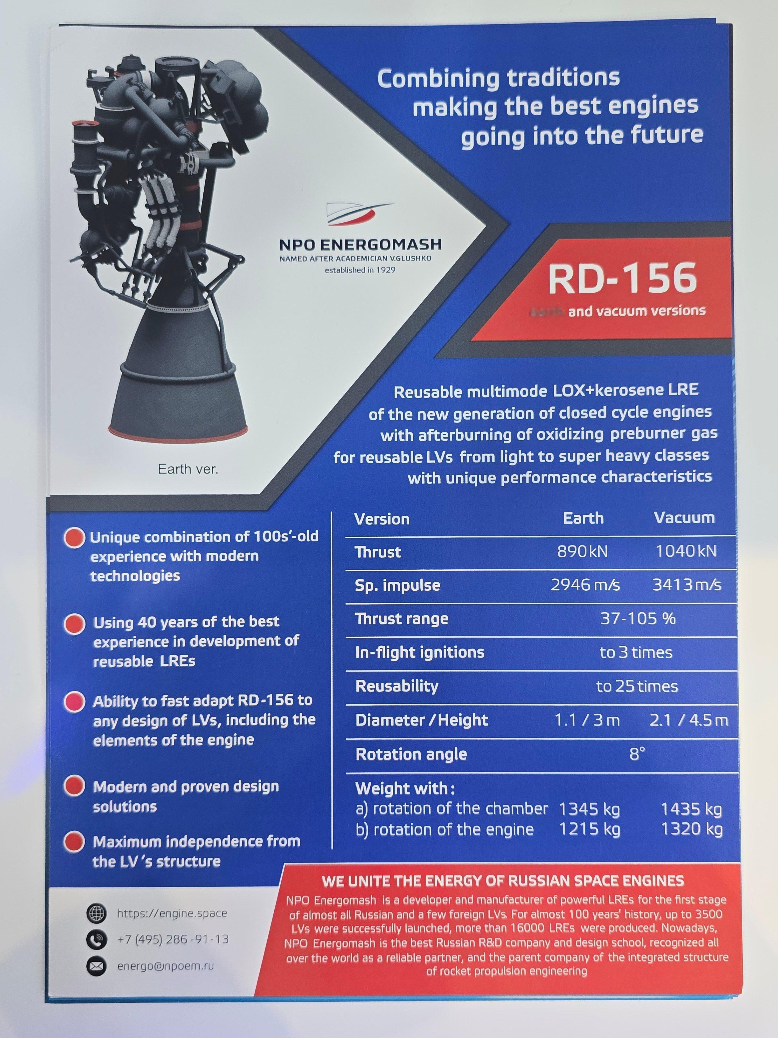 第19届迪拜国际航空航天与防务展(DAS 2025):RD-156火箭发动机🔹可重复使用的多模液氧+煤油火箭发动机🔹新一代闭式循环发动机,采用氧化预燃室气体后燃(通常指分级燃烧循环),可用于可重复使用的轻型至超重型运载火箭,具有独特的性能参数。🔹仅需5-7天整备,即可复用。