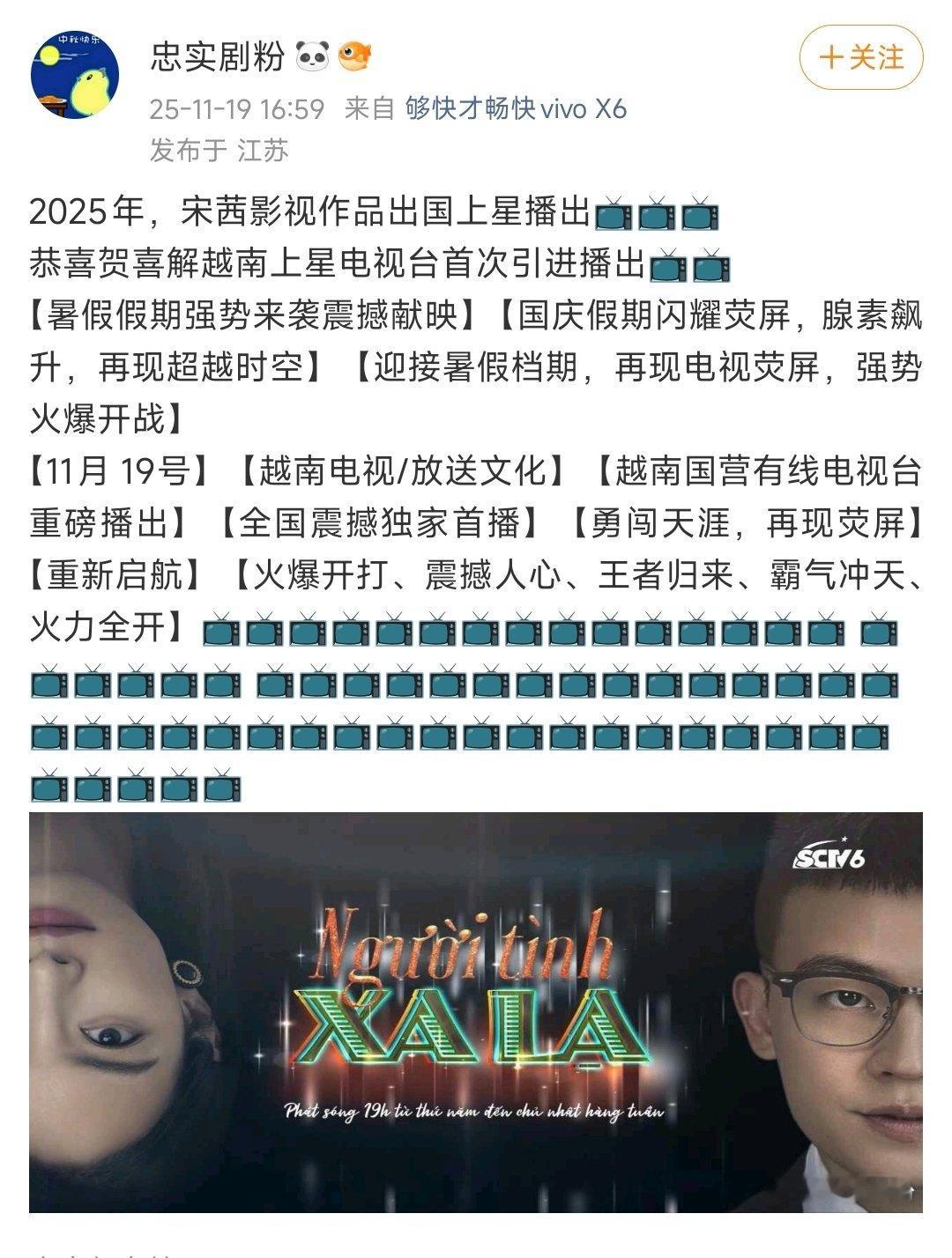 宋茜一番女主剧《陌生的恋人》越南上星播出!宋茜回来晚拍的戏不是特别多,但基本上每部都能卖各种海外版权,海外影响力不是随便说说的。在影视行业这么不景气的情况下宋茜还能一直有女主戏就是因为剧好卖,赚钱,资本不傻,赚不赚钱他们心里清楚的很,宋茜🐂🍺。