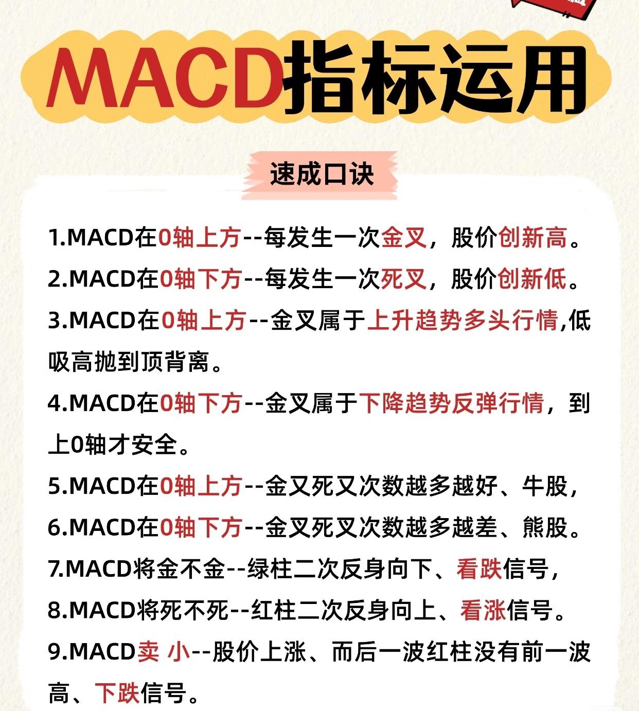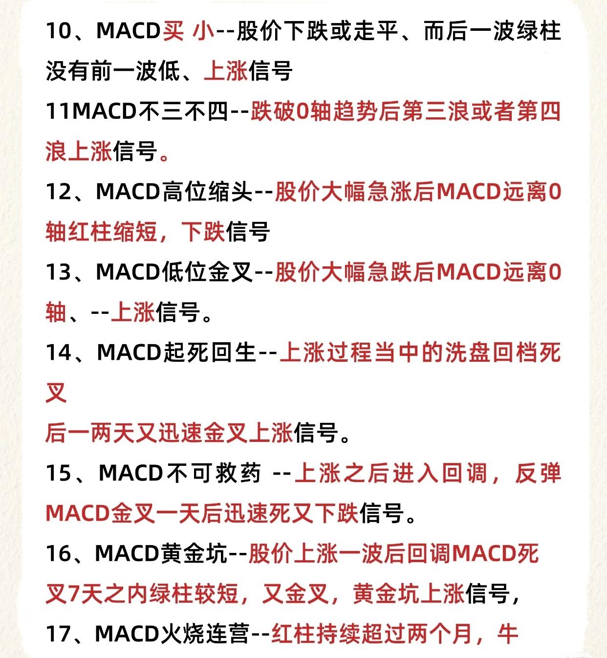 以下是对MACD指标运用及常见形态信号的总结: MACD指标是一种常用的技术分析工具,通过观察MACD线与信号线在零轴(0轴)上下方的金叉(快线上穿慢线)、死叉(快线下穿慢线),以及红绿柱的变化,来判断股票价格的走势与买卖信号。 一、MACD基础运用口诀(总结自第1张图): 1. MACD在0轴上方时: - 每出现一次金叉,通常意味着股价会创新高,处于强势上升趋势中; - 此时的金叉属于多头市场,适合低吸高抛操作,但要注意顶背离信号的出现; - 金叉与死叉发生的次数越多,代表该股越可能是牛股,趋势越强。 2. MACD在0轴下方时: - 每出现一次死叉,通常意味着股价会创新低,处于弱势下跌趋势中; - 此时的金叉往往只是下降趋势中的反弹,只有当MACD突破0轴后才相对安全; - 金叉与死叉次数越多,代表该股可能越弱,是熊股的概率大。 3. 特殊形态信号: - MACD将金不金: 快线即将金叉却未金叉,绿柱再次向下,是看跌信号; - MACD将死不死: 快线即将死叉却未死叉,红柱再次向上,是看涨信号; - MACD卖小: 股价上涨后,红柱高度逐波降低(即后一波红柱比前一波矮),是潜在的下跌信号。 二、MACD常见形态及对应信号(总结自第2张图): 除了基础的金叉死叉外,MACD还有一些特殊形态,各自代表不同的市场信号: 4. MACD买小: 股价下跌或走平后,绿柱逐波减小(后一波绿柱没有前一波低),是上涨信号。 5. MACD不三不四: 股价跌破0轴进入下跌趋势后,在第三或第四浪出现上涨,有一定上涨信号,但需谨慎对待。 6. MACD高位缩头: 股价大幅急涨后,MACD远离0轴且红柱开始缩短,是短期见顶、可能下跌的信号。 7. MACD低位金叉: 股价大幅急跌后,MACD远离0轴的情况下出现金叉,通常是止跌回升的上涨信号。 8. MACD起死回生: 在上涨过程中,股价出现回调并发生死叉,但在随后一两天内快速再次金叉,是继续上涨的信号。 9. MACD不可救药: 股价上涨后回调,反弹时虽然出现金叉,但仅维持一天随即又死叉,是强烈的下跌信号。 10. MACD黄金坑: 股价经历一波上涨后回调,若在回调期间MACD死叉,但7天内绿柱不长,并迅速再次金叉,是“黄金坑”形态,预示后续上涨机会。 11. MACD火烧连营: 红柱持续出现超过两个月,代表强势多头行情持续,是牛市信号。 综合理解: - 0轴是多空分界线: MACD在0轴上方运行,整体偏多头;在0轴下方运行,整体偏空头。 - 金叉与死叉: 是最基本的买卖信号,但需结合其所处位置(0轴上下)及出现频率综合判断。 - 红绿柱变化: 反映多空力量的强弱,柱体高度变化(如“买小”、“卖小”)也能提供短期买卖提示。 - 特殊形态: 如“将金不金”、“将死不死”、“黄金坑”、“火烧连营”等,是实战中更为细致和实用的市场信号,有助于捕捉转折点或确认趋势。 掌握这些基本规则与形态,有助于投资者利用MACD指标进行趋势判断、买卖时机选择和风险控制。
