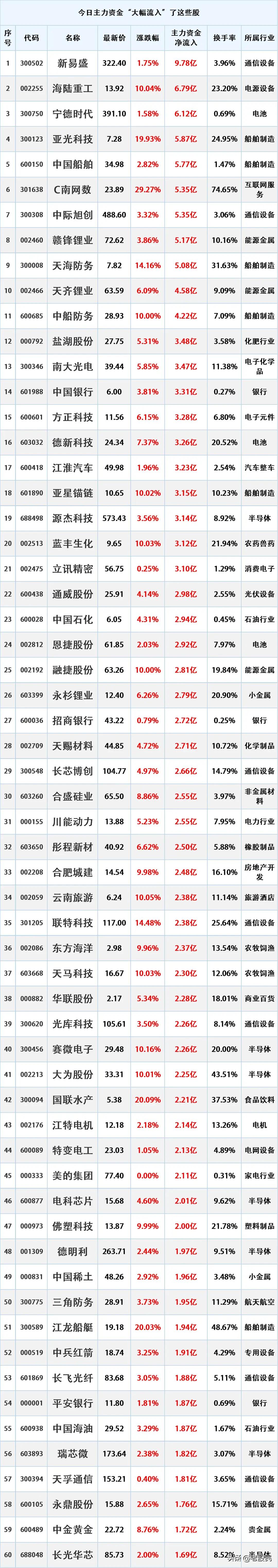 尾盘资金入场,11月19日主力资金大幅流入的股票名单。 资金流入是指在一定时期内(如一天、一周等),主动买入某只股票的资金量大于主动卖出该股票的资金量。主动买入是指投资者以卖方的报价直接成交,显示出投资者对该股票的积极购买意愿。