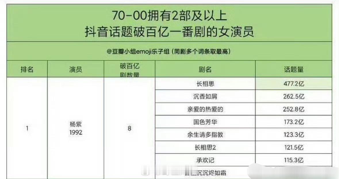 dy话题破百亿一番剧女演员里面,杨紫直接八部自己主演的剧达到这个标准,90花里面,杨紫的这个影视剧实绩,真的是放在哪里都很亮眼的存在啊
