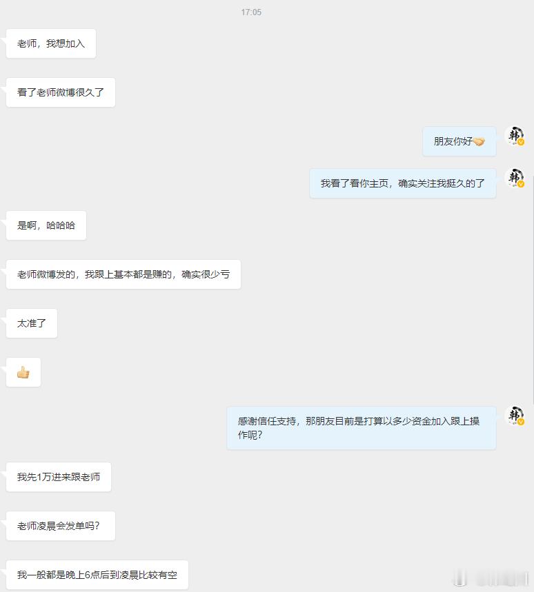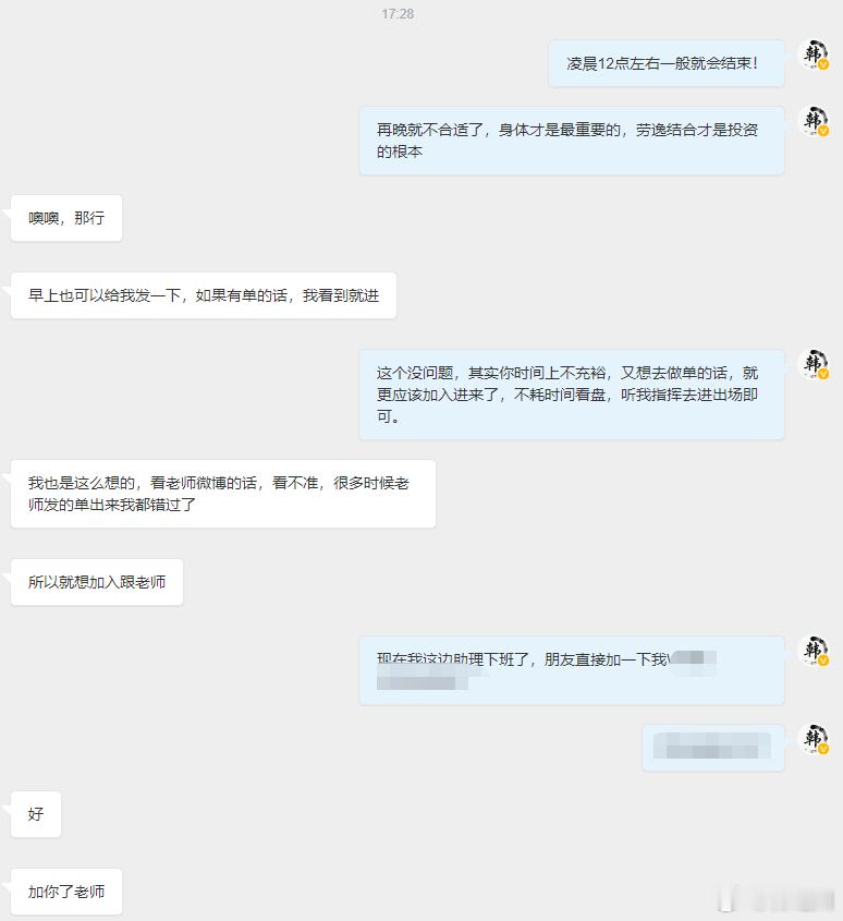 又一位老粉丝朋友准备加入老韩盘中,跟上本人实时指导!欢迎你的加入目前可能还有很多跟这位还没加入老韩盘中的投资朋友一样,对于我每日带单的操作时间不太了解,那么这位粉丝朋友刚好问起,凌晨会不会继续指导发单,我这里就给大家统一回复一下:无论是微博还是本人盘内,过了凌晨12点左右,基本都是不会再去分享和布局给单大家,每日的操作时间一般在上午的9点-晚上1点前,我想,各位投资者朋友也是想着去赚的更多,不过老韩却认为,身体才是革命的本钱,劳逸结合才是投资的根本,在操作时间上,老韩会尽心尽责的带好大家,让每一位信任老韩的投资朋友都能从中获得满意的收益!另外,行情每时每刻都在波动,操作当中更该避免的是频繁去参与,每日少说都会给到那么几次大行情机会,稳健等待再去跟紧老韩着手进场即可,错过就继续再等,保持稳定持续增益!这里若有独自去频繁操作,管不住手的就要多听了,刚入市没多久的新手朋友可能不太了解,但经验老道的交易者一看就清楚其中利弊端!自身频繁交易无异于会显著增加自身亏损风险,侵蚀收益,还会放大操作与自身心理压力!高频操作容易忽略市场趋势,失误率也会是大幅提高!少即是多,动即是误,每日操作应该少而精,心态越稳的人,往往才能笑到最后!