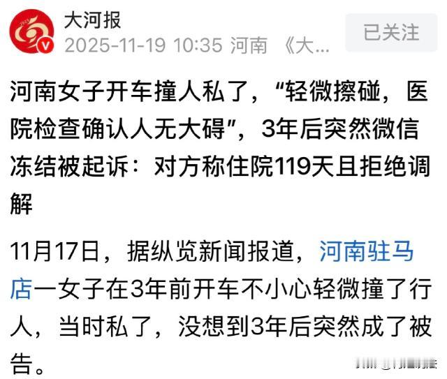 河南驻马店,三年前刘女士开车时不小心撞到一路人,送医检查后医生称只是轻微碰撞无大碍,刘女士付了几百元误工费。三年后,刘女士的微 信被法院冻结,才知被撞者起诉,对方拿出119天住院记录及治疗证明,刘女士怀疑被讹。 三年前,刘女士开车上班时,不小心蹭到了一位路人。当时看对方没大事,两人就在路边商量起来。 刘女士主动提出带对方去医院检查,全套检查下来,医生说只是软组织挫伤,连药都不用开。 刘女士当场给了对方几百元误工费,这事她以为就这么过去了。 三年后,刘女士准备买早餐,用微 信付款时,却发现支付功能被冻结了。 她赶紧查账户,这才看到法院发来的通知,原来三年前被撞的那个人把她给告了。 刘女士懵了,这三年对方一次都没联系过她,咋突然就起诉了呢? 她赶紧联系法院,拿到了对方提交的证据材料。 一沓厚厚的病历,从撞车那天到2025年初,住院记录加起来有119天,还有一大堆康复治疗的单子。 刘女士看着这些材料,越看越不对劲。 当年医生都说不用吃药,现在咋冒出这么多治疗? 她决定,找对方问个清楚。 通过法院,刘女士终于联系上了对方。 电话一接通,刘女士就急切地说:咱当年不是说好了,检查完没事,我给了误工费,这事就了了吗? 对方却说:当年是没事,可后来我这身体越来越差,去医院检查,医生说是当年那车祸留下的后遗症。 刘女士一听就火了:后遗症?当年医生都说只是软组织挫伤,连药都不用开,咋会有后遗症?你这不是讹人吗? 对方也不示弱:医生当时只是说当时没事,谁能保证以后没事?我这三年看了好多医生,都说和当年车祸有关。 刘女士说:那你这三年为啥不找我?现在突然就起诉,还冻结我账户,这不是故意的吗? 对方说:我这三年一直在治疗,哪有时间找你?现在治疗结束了,我才想起要你赔偿。 刘女士觉得对方就是在胡搅蛮缠,她决定找律师咨询。 律师告诉她,从法律角度看,对方三年后起诉是否超时效,要看治疗与车祸的因果关系,如果治疗和车祸有关,可能从最后一次治疗结束重新起算时效;如果无关,则可能超时效。 而且,刘女士和对方私了没签书面协议,法院很难认定私了的效力。 对方提交的证据得满足真实性、合法性、关联性要求,刘女士可以申请司法鉴定验证因果关系。 如果对方拒不配合,法院可以推定其主张缺乏依据。 刘女士听了律师的话,心里有了底。 她决定申请司法鉴定,可对方却开始推三阻四,一会说回老家了,一会说身体不舒服,就是不肯配合,最后,鉴定机构都退单了。 刘女士觉得对方就是在故意拖延,想让她妥协。 这期间,刘女士也在想,为啥会出现这种情况?是不是自己当初私了太草率了?要是当初签个书面协议,是不是就不会有这么多麻烦? 根据《民法典》第一百八十八条规定:向人民法院请求保护民事权利的诉讼时效期间为三年。法律另有规定的,依照其规定。诉讼时效期间自权利人知道或者应当知道权利受到损害以及义务人之日起计算。法律另有规定的,依照其规定。 但是,自权利受到损害之日起超过二十年的,人民法院不予保护,有特殊情况的,人民法院可以根据权利人的申请决定延长。 这里就存在几个关键问题值得讨论: 第一,对方三年都没联系刘女士,现在突然起诉,这三年里他真的一直在治疗且不知道该找刘女士吗? 第二,如果对方所谓的后遗症和车祸无关,那他三年后起诉是不是就超过诉讼时效了? 从实际情况看,对方三年未联系刘女士,很难让人相信他一直在积极治疗且不知该主张权利。 而且,当年医生明确表示只是软组织挫伤,连药都不用开,现在突然冒出大量治疗记录,其治疗与车祸的关联性存疑。 如果最终认定治疗与车祸无关,那么对方三年后起诉很可能就超过了诉讼时效,法院可能不会支持其诉求。 但如果能证明治疗与车祸有关,且符合时效重新起算的条件,那诉讼时效方面就可能不存在问题。 所以,关键还是要看对方能否提供有力证据证明治疗与车祸的因果关系,以及是否符合时效起算的规定。 遇到这种情况,该咋办呢? 私了可以,但一定要签书面协议,明确双方的责任和赔偿金额。 如果对方事后反悔,要及时收集证据,通过法律途径解决。 遇到对方不合理的要求,不要妥协,要坚决维护自己的合法权益。 回到刘女士的案子,法院开庭那天,双方都到了。 刘女士的律师详细阐述了观点,认为对方的治疗和车祸没有因果关系,申请司法鉴定对方又拒不配合,法院应该驳回对方的诉求。 对方的律师则坚持认为,治疗和车祸有关,要求刘女士赔偿。 法官听取了双方的意见后,决定再次组织调解。 法官对对方说:你提交的证据得有说服力,司法鉴定你不配合,这很难让法院支持你的主张。 对方却还是坚持自己的观点,不愿意让步。 调解失败后,法院宣布择日宣判。 现在,这案子还没判下来,刘女士的支付功能仍冻结着。 她每天都在盼着法院能尽快判决,还她一个公道。