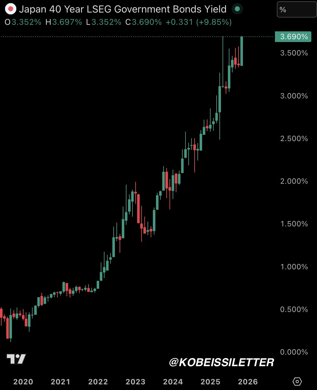 🔻日本 40 年期国债收益率飙升至 3.697%,创历史新高。
