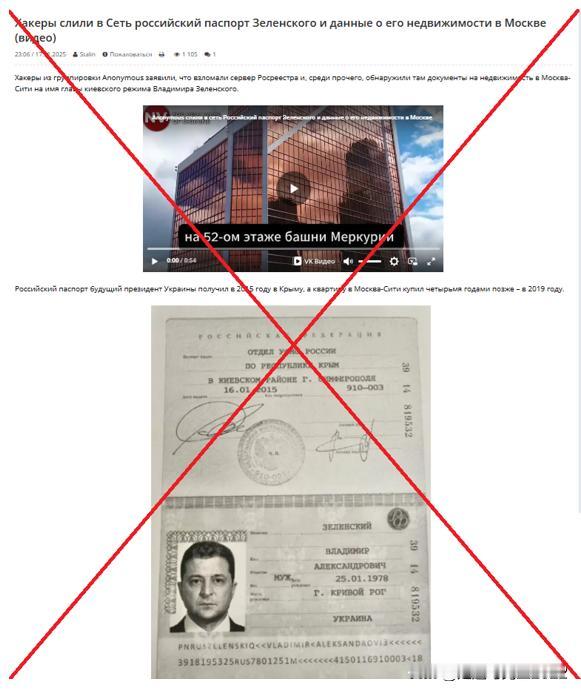 俄罗斯散布关于泽连斯基拥有俄罗斯护照及在莫斯科房地产的假消息 俄罗斯的媒体以及电报平台,传播了一段带有乌克兰媒体NV英文版网站和油管频道标识的视频。视频里宣称,找到泽连斯基的俄罗斯护照相关信息,说这本护照,是2015年在克里米亚发给他的。另外,还表示,黑客根据护照上的信息,发现泽连斯基在莫斯科拥有一套价值近两百万美元的公寓。 乌方证明,这完全是虚假信息。不管是NV的网站,还是该媒体在油管平台的视频,都没有这个内容,其最新视频是四周前发布的。 护照上的泽连斯基照片是伪造的。俄罗斯人,在使用图像编辑软件,添加照片时,居然是2022年2月24日的,而签发时间却是2015年。这张照片,实际上是泽连斯基总统,在俄罗斯入侵乌克兰前几个小时录制视频讲话时的截图,那次是关于俄罗斯承认所谓的卢甘斯克和顿涅茨克两个伪“人民共和国“的讲话。 至于编造泽连斯基在莫斯科拥有公寓,更是可笑,因为,这个谎言是用上一个伪造的护照的谎言,来“证明”的。 这并不是俄罗斯方面,头一回散布关于泽连斯基有虚假俄罗斯护照的消息。2022年的时候,俄罗斯人就公布过一份类似的文件,说这份文件是2001年在莫斯科州签发的。当时,是由是前乌克兰议员基瓦,炮制的虚假信息。 虚假信息的目的:抹黑乌克兰总统泽连斯基。