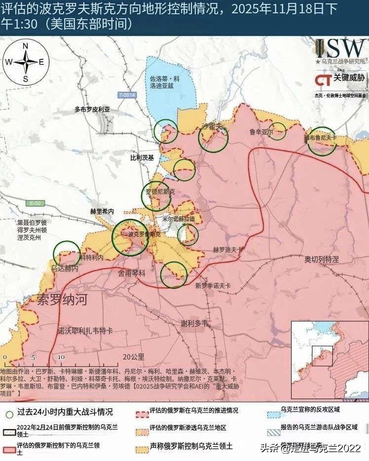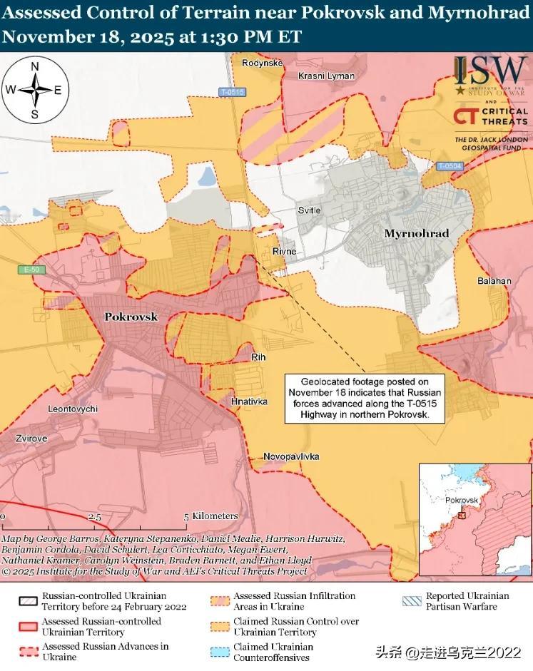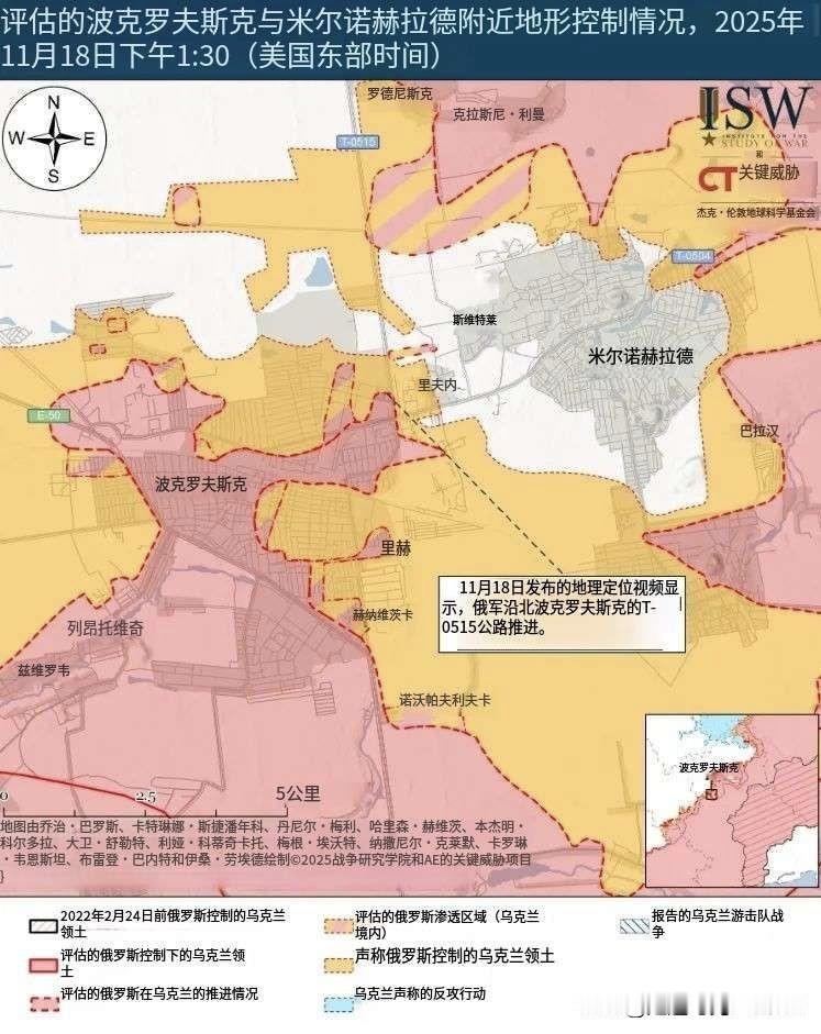俄军试图包围波克罗夫斯克-米尔诺赫拉德:ISW分析 俄罗斯占领者持续同时发力,试图在广阔的波克罗夫斯克-米尔诺赫拉德地带完成合围圈,对这两座城市发动攻击。与此同时,侵略者在波克罗夫斯克方向上,对一个决定性目标难以集中精力进攻。 俄罗斯军事指挥部继续在该战线发动正面进攻。战争研究所报告。 波克罗夫斯克方向: 11月18日公布的地理定位显示,近期,俄军在波克罗夫斯克东北方向有所推进。11月18日,乌克兰空降突击部队第7快速反应军团通报称,俄军越来越频繁地试图从利曼方向(米尔诺赫拉德以北)突入米尔诺赫拉德。 敌方的战术表明,在米尔诺赫拉德以北行动的俄军,并未集中精力向西推进,以完成合围,而是试图向南直接进攻米尔诺赫拉德。在波克罗夫斯克方向作战的乌克兰某旅代表称,俄军正试图从西北和西面切断乌克兰通往米尔诺赫拉德的地面交通线路。 俄军还向乌军在整个波克罗夫斯克-米尔诺赫拉德城市群的阵地投掷炸弹。这会威胁到乌克兰的后勤保障,还可能摧毁乌克兰军队在该地区更广泛的空中压制行动中,使用的建筑物及其他掩体。 此前有报道称,俄军试图将乌克兰军队围困在波克罗夫斯克市内。与此同时,敌方打算从西面包围波克罗夫斯克-米尔诺赫拉德城市群的乌克兰武装部队。敌方计划利用运输工具运送部队,很可能趁着大雾掩护,以加速占领波克罗夫斯克。 据乌媒报道,在波克罗夫斯克方向,俄罗斯占领者越来越频繁地误伤己方战友。在俄军内部混乱不堪的情况下,俄罗斯无人机操作员,将渗透到波克罗夫斯克和米尔诺赫拉德的俄军突击队员误认为敌方,并对其发动攻击。 注:后面两张地图为机器翻译,仅供参考。