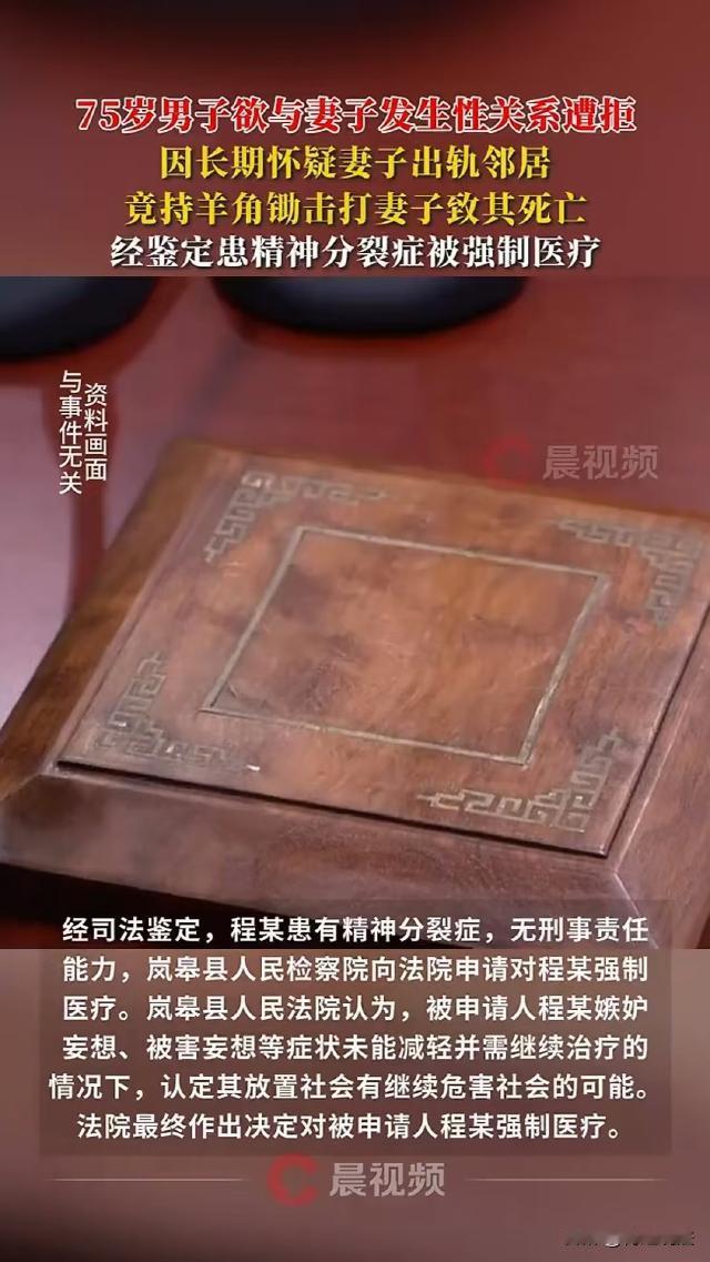 陕西安康,75岁男子酒后想和妻子发生关系被拒,怀疑妻子和邻居有染,于是持羊角锄将妻子杀害。案发后,男子被鉴定出精神分裂,检方申请对男子进行强制医疗。 据红星新闻、潇湘晨报等报道,今年75岁的程某是岚皋县人。 程某和妻子结婚多年,两人虽然生活在同一个屋檐下,但是感情一般,夫妻二人一人一个房间,分房而卧已久。 2025年2月2日下午,程某去隔壁兄弟家吃晚饭,饭间程某喝了不少酒,晚上9点钟左右程某回自己家睡觉。 半夜11点左右,程某的妻子张某从程某房间门口路过,准备回自己房间睡觉。 或许是喝了酒的缘故,程某突然萌生出一种冲动,想要和妻子张某发生关系,于是程某走出去拉住张某求欢。 张某觉得程某一大把年纪了还老不正经,拒绝了他的要求,回到自己房间睡下。 可返回自己房间的程某却久久无法入睡,原来,程某年轻时候就觉得,张某和邻居谭某有一腿,这次被妻子拒绝,程某再次怀疑妻子背叛了自己。 程某越想越气,于是到后院拿了一把羊角锄进入张某房间,对着睡着的张某的脸打了过去,击打多次后,程某出了一口恶气,将羊角锄放回院子里,回到自己房间睡觉。 过了一会后,程某去张某房间查看,发现张某疑似死 亡,但他并没有采取任何动作,而是返回房间继续睡觉。 第二天一早7点钟左右,张某的儿子去她房间里找钥匙,发现张某已经僵硬了。 案发后,村干部报了警,程某被抓获,并对杀 害张某一事供认不讳。 案件侦查阶段,程某和张某的孩子们反映,程某精神有点问题。 经司法鉴定,程某有精神分裂,案发时正处于发病期间,无刑事责任能力。 程某的应该应该如何认定?他是否可以免除处罚? 1、程某涉嫌故意杀人罪。 根据《刑法》第二百三十二条规定,故意杀 人的,构成故意杀 人罪。 程某求欢被妻子拒绝后,因怀疑妻子背叛自己,产生愤怒情绪,随后到后院拿羊角锄进入张某房间,对着睡着的张某脸部多次击打,其行为具有明确的杀 人故意和积极的杀 人行为。 在击打后,程某还去查看,发现张某疑似死 亡也未采取任何救助措施,这些行为充分表明其主观上具有非法剥夺他人生命的故意,客观上实施了导致他人死 亡的行为,完全符合故意杀 人罪的客观构成要件。 2、程某无需承担刑事责任。 虽然程某的行为从客观表现上符合故意杀 人罪的特征,但《刑法》第十八条规定,精神病人在不能辨认或者不能控制自己行为的时候造成危害结果,经法定程序鉴定确认的,不负刑事责任。 本案中,经司法鉴定,程某有精神分裂,案发时正处于发病期间,无刑事责任能力。 这意味着程某在实施杀 人行为时,由于精神疾病的影响,无法正确认识自己行为的性质、后果和意义,也无法有效地控制自己的行为。 因此,从主观责任能力的角度来看,程某不具备承担刑事责任的条件,不能认定其构成故意杀 人罪并承担相应的刑事处罚。 3、程某为什么会被强制医疗? 案发后,检方认为,程某发病后嫉妒妄想、被害妄想等症状有继续危害社会可能,随着程某的病情加重,不能确保家属能够监管到位,于是申请对程某强制医疗。 根据《刑事诉讼法》第三百零规定,实施暴力行为,危害公共安全或者严重危害公民人身安全,经法定程序鉴定依法不负刑事责任的精神病人,有继续危害社会可能的,可以予以强制医疗。 程某在发病期间实施了严重的暴力杀 人行为,考虑到其实施的杀 人行为的严重性和精神疾病的存在,检方申请对其进行强制医疗是符合法律规定的。 强制医疗程序的目的并非是对行为人进行惩罚,而是为了保障社会公共安全和公民的人身安全,同时也是为了对精神病人进行治疗和康复。 通过强制医疗,程某可以接受系统的治疗,缓解其精神疾病症状,降低其再次实施危害行为的可能性。 法院认为,程某实施了故意伤害致一人死 亡的行为,但因其案发时处于发病阶段,且症状未减轻,将其放置社会有继续危害社会的可能,对检方提出的对程某采取强制医疗予以支持。
