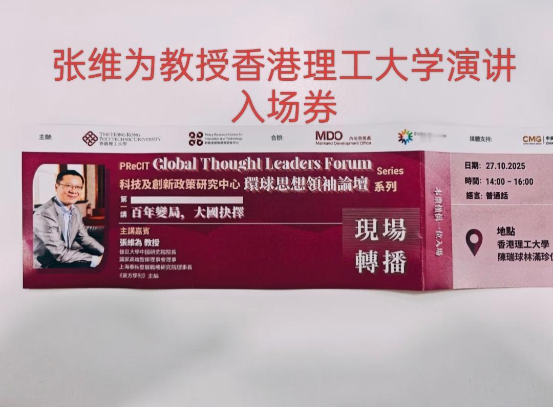 张维为教授在香港理工大学受到的礼遇。 如图一所示,在港理工学校的大厅柱子上,张教授人未到时,就已经贴了宣传海报了。图一可见的柱子上都贴了宣传海报,看来港理工还费了不少心思。 如图二所示,这是张维为教授讲座的入场券。这张入场券不仅设计精美,还介绍了张教授的一些职务。 看来这一次港理工为张教授还是准备了不少,足可以看到港理工对于张教授到来的期待。香港理工大学对于张教授到来是持欢迎的态度,并希望学生们能有所感悟的。