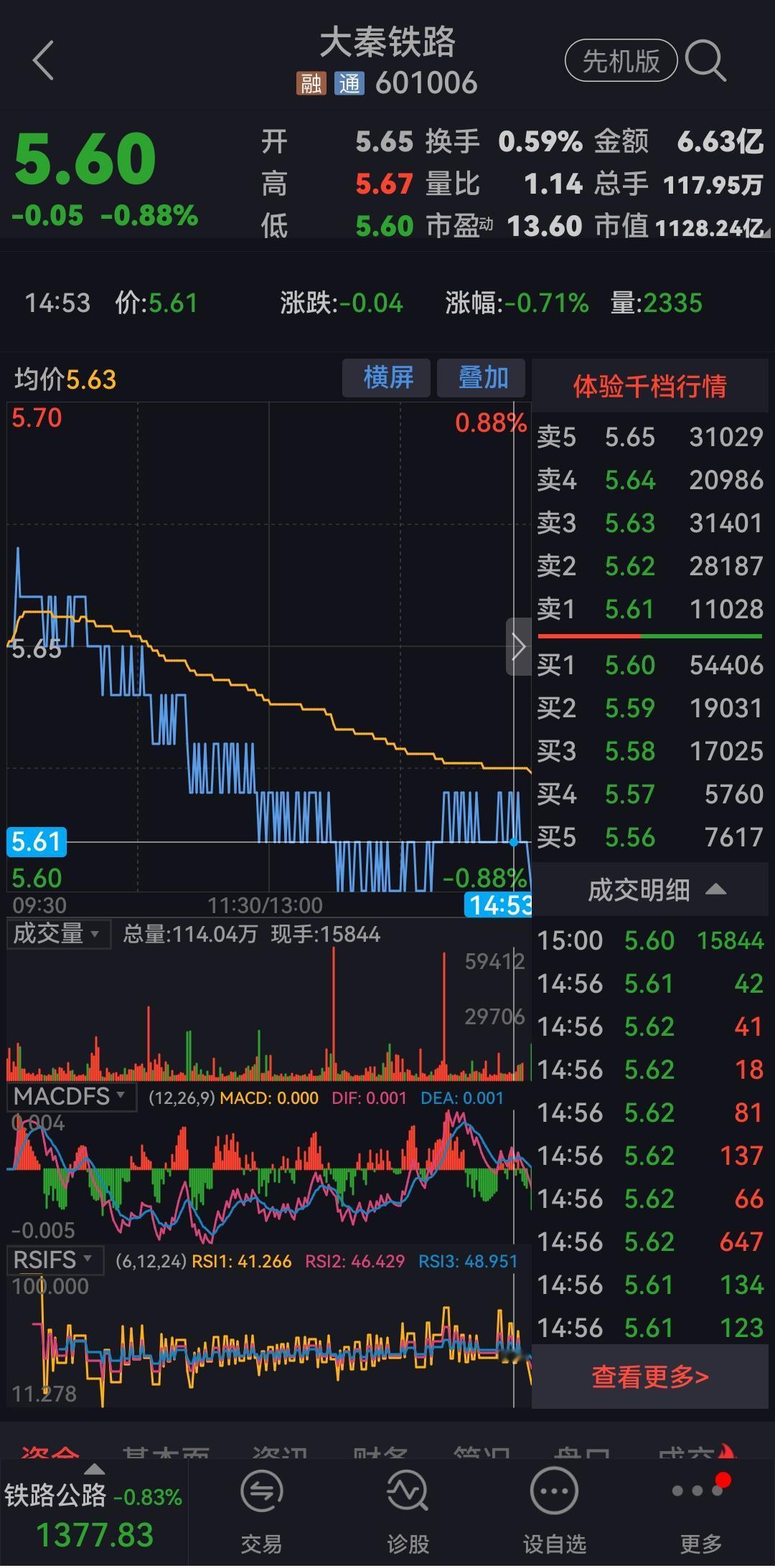 谢天谢地,今天果断出手,5.65元卖掉大秦铁路,虽然赔了不少,但是看到5.6元收盘,而且没有一点止跌的迹象,内心多少欣慰一些,对大秦铁路失望透透的,收盘后,毫不犹豫将大秦铁路从自选栏里删除,我发誓,从此不再关注这只股票了。