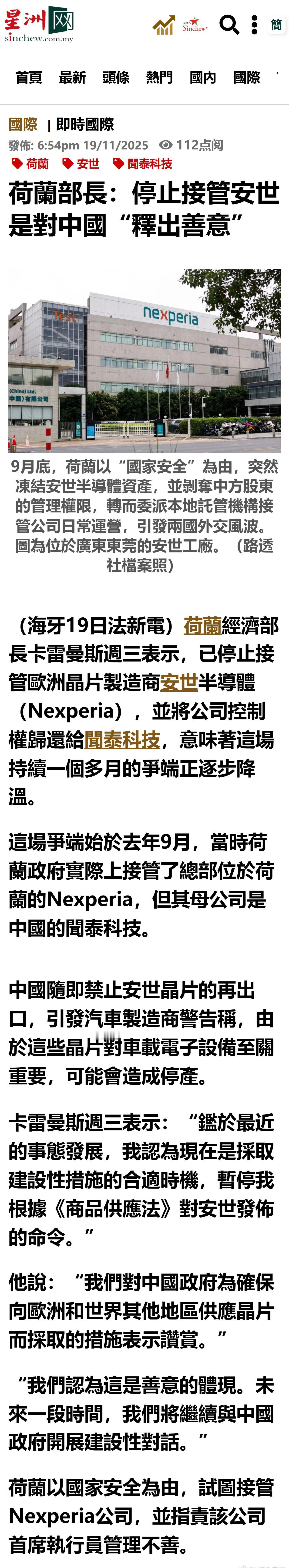 荷兰部长:停止接管安世 是对中国“释出善意”[抠鼻]