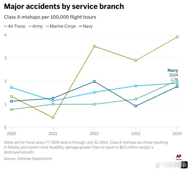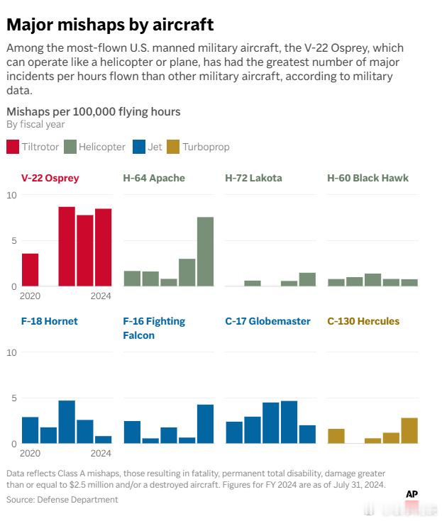 【数据显示,美军飞机事故激增】(美联社)——五角大楼内部数据显示,2024 年涉及军用飞机的重大事故数量激增,而 2025 年发生的一系列造成人员伤亡和飞机损失的高调航空事故表明,这种令人不安的趋势可能会继续下去。2024财年,美军每10万飞行小时的严重事故发生率比四年前上升了55%。其中,海军陆战队的增幅最大,同期事故发生率几乎翻了三倍。国防部向国会公布的数据,并独家提供给了美联社,该数据追踪了 A 类事故——最严重的事故,会导致死亡或永久性完全残疾。一位航空专家指出,整体恶化的趋势不太可能是单一因素造成的,而是多种较小问题累积的结果,最终导致不安全的飞行环境。这些问题包括作战需求增加、V-22“鱼鹰”等风险更高的飞机,以及新冠疫情等突发事件,这些事件导致军方飞行时间大幅减少。但不断上升的严重事故数量让国会中的一些人开始寻求答案。今年1月,在V-22“鱼鹰”倾转旋翼机发生一系列致命事故后,马萨诸塞州民主党参议员伊丽莎白·沃伦的办公室要求提供相关数据。沃伦的办公室随后将数据提供给了美联社,美联社对其进行了独立审查。统计数据涵盖了 2020-2023 财年以及 2024 财年的前 10 个月(截至 7 月 31 日)。在去年的这 10 个月里,共有 25 名军人和国防部文职人员丧生,14 架飞机被摧毁。沃伦在发给美联社的电子邮件声明中表示:“这些事故率令人极其担忧,必须采取行动。”她表示,亟需进行立法改革,使事故报告更容易获取,“以便国会能够了解这些事故的根本原因,从而挽救军人的生命。”——一些军用飞机特别容易坠毁。据美联社广泛报道,鱼鹰飞机飞行时像飞机一样,但降落时却像直升机一样,它一直是世界上最危险的飞机之一。此外,国防部最新数据显示,2024财年阿帕奇直升机发生最严重A级事故的概率约为四年前的4.5倍。作为军方主力机型的C-130运输机,同期事故率几乎翻了一番,尽管其间也存在一些相对安全的年份。当被问及这些趋势时,五角大楼没有立即作出回应。海军自身航空事故数据显示,今年事故数量显著增加。海军安全司令部报告称,2024年共发生8起A级航空事故,而2025年这一数字飙升至14起。航空专家、前军用飞行员约翰·南斯表示,军用飞行员面临的日益增长的要求很可能是导致事故数量不断增加的主要原因。南斯说:“无论是谈论阿富汗战争的结束,还是谈论向吉布提的部署,亦或是往返沙特阿拉伯前往阿联酋,我认为随着(军事行动的)节奏加快,事故也会随之增加。”——今年发生了一系列事故。虽然数据没有延续到 2025 年,但今年已经发生了多起备受瞩目的航空事故,包括海上航空母舰的一系列事故,以及 1 月份在华盛顿特区发生的陆军直升机与客机相撞事故,造成 67 人死亡。调查发现,黑鹰直升机的高度表坏了,军用飞行员的夜视镜有问题,而且联邦航空管理局没有处理有关直升机在华盛顿机场附近区域造成的危险的警告。南斯说,与民用飞行员不同,军用飞行员在飞行时面临的可预测性和规律性要少得多。他说:“飞机指挥官们……根据他们所掌握的最佳信息做出决定,但这些决定都是临时做出的,其中存在着一定程度的不确定性和不可预测性,远远超出了商业航空公司所经历的任何情况。”今年春天,美国海军的“哈里·S·杜鲁门”号航空母舰在短短几周内损失了两架F/A-18“超级大黄蜂”战斗机——一架因着陆失误坠毁,另一架从甲板上滑落落入海中。2024 年 12 月,导弹巡洋舰“葛底斯堡”号误击落了一架来自航母的 F/A-18 战斗机。在这些事件中,没有飞行员丧生。海军尚未公布对这些事故原因的调查结果。最近,四名美国陆军士兵在华盛顿州的一个军事基地附近执行夜间任务时,乘坐的黑鹰直升机坠毁,导致他们全部遇难。随后在 10 月份,一架战斗机和一架从尼米兹号航空母舰上起飞的直升机在 30 分钟内相继坠入南海,所幸无人伤亡。南斯不排除事故激增是 COVID-19 大流行带来的后续影响的可能性,因为疫情期间军用飞行员的飞行时间大大减少。南斯说:“安全缓冲受到无数因素的影响。”有些因素影响甚微,有些则影响巨大。他认为,新冠疫情“对作战能力造成了重大影响”。据美联社审阅的一份致五角大楼的请求显示,沃伦办公室目前要求五角大楼提供更详细的航空事故数据,并涵盖2019年至2025年更长的时间跨度。该请求不仅包含有关A类事故的问题,还要求提供较轻微的B类和C类事故的数据。沃伦的办公室还就军方如何训练其机组人员和维修人员提出了更多问题。
