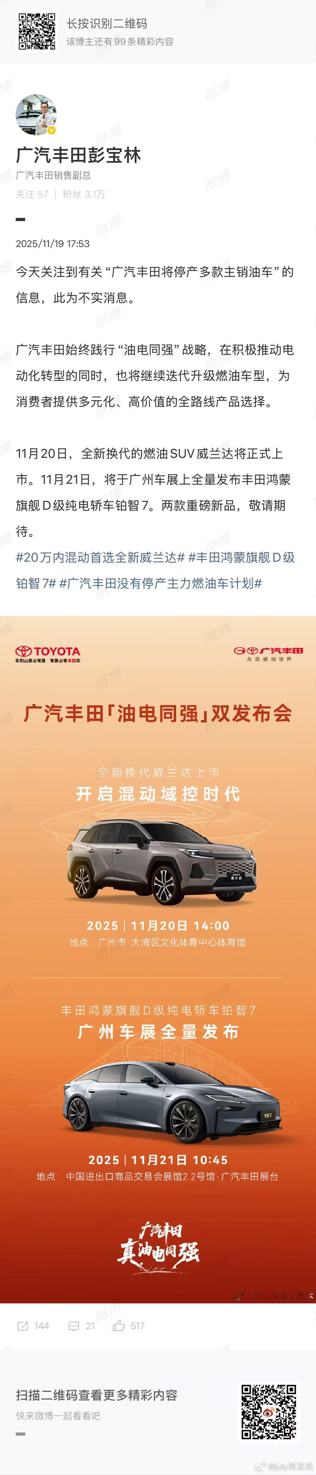 “广汽丰田将停产多款主销油车”的信息, 彭总已证实此为不实消息。广汽丰田一直都在践行“油电同强”战略,在积极推动电动化转型的同时,也将继续迭代升级燃油车型,像11月20日,全新的换代燃油SUV威兰达将正式上市,敬请期待。不信谣不传谣