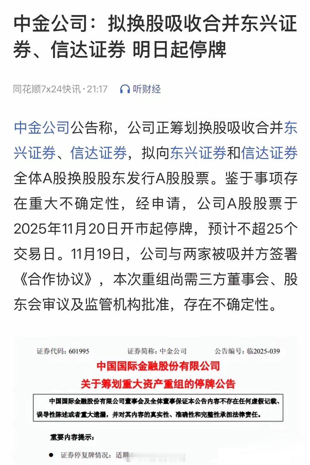 重大利好消息券商板块整合开始,明天A股大涨突破4000点:11月19日A股今天企稳,明天A股将在券商板块带动下大涨突破4000点!因为利好消息来了,中金公司吸收合并两家券商!又一家超千亿规模的中资券商将诞生。中金公司一下子吸收两家券商,十分罕见。券商板块大跌了很久,低位迎来利好消息,明天将起飞带动大盘重新突破4000点,继续结构性牛市,不信点赞关注验证高手的预判。