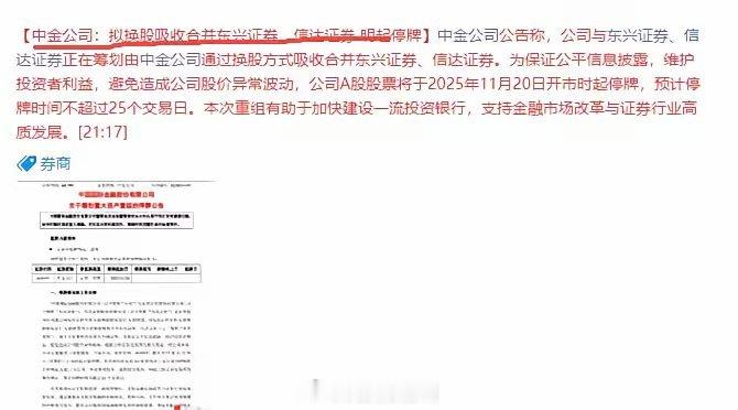 突发券商重磅利好来了,明天指数能否大阳线修复?还不知道什么的快来看看吧中金公司公告称,公司与东兴证券、信达证券正在筹划由中金公司通过换股方式吸收合并东兴证券、信达证券。为保证公平信息披露,维护投资者利益,避免造成公司股价异常波动,公司A股股票将于2025年11月20日开市时起停牌,预计停牌时间不超过25个交易日。本次重组有助于加快建设一流投资银行,支持金融市场改革与证券行业高质发展。券商合并加速 这一消息大家不陌生,晚间这一则消息 再次让券商进入到加速段,在之前已经有多家头部券商吸收合并,今日指数连续调整,券商的利好消息无疑就是给市场一剂强心针为什么这么说? 因为 今天 保险 银行都已经异动护盘拉升,今天券商纹丝不动,晚间来这个重大利好,意味着资金没有抢跑 那么明天我们重点去盯着券商走势即可牛市旗手出利好 市场短期见底信号就来了 明天关注券商高开之后 是继续高打还是回落,如果回落那么就是讨人,如果高开上板之类 那么明天就是收获了总之 指数在3922附近止跌,短线往下空间不大,利好来袭 明天是红周四吗?评论区聊聊?