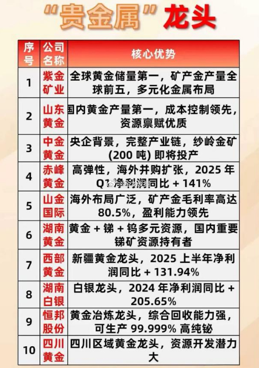 贵金属板块核心分析贵金属板块在资源领域中占据重要战略地位,各细分领域龙头企业凭借独特竞争优势构筑起坚实的发展护城河。核心企业优势分析黄金板块呈现多元化发展格局:头部企业依托全球领先的矿产资源储量和产能规模,通过多元化金属布局有效抵御周期波动;优质区域龙头则凭借高品位资源禀赋和精细化管理,在成本控制方面建立显著优势;产业链完整的企业伴随重大项目陆续投产,正迎来新的增长周期。白银领域同样表现亮眼,相关企业受益于白银价格景气度提升,利润增长动能强劲。而以冶炼提纯技术为核心的企业,通过综合回收利用技术实现资源价值最大化,在循环经济领域占据先机。市场表现与驱动因素在当前通胀预期升温与避险需求驱动的市场环境下,板块关注度持续提升,多家企业业绩实现显著增长,反映出行业整体盈利能力的改善。展望未来,随着全球矿产资源战略价值日益凸显,拥有优质资源储备、领先成本控制能力及核心技术壁垒的企业有望持续受益。尽管板块表现仍受宏观环境与金属价格波动影响,但中长期来看,具备核心竞争优势的企业将继续呈现结构性机会,值得密切关注政策导向与供需格局的后续演变。