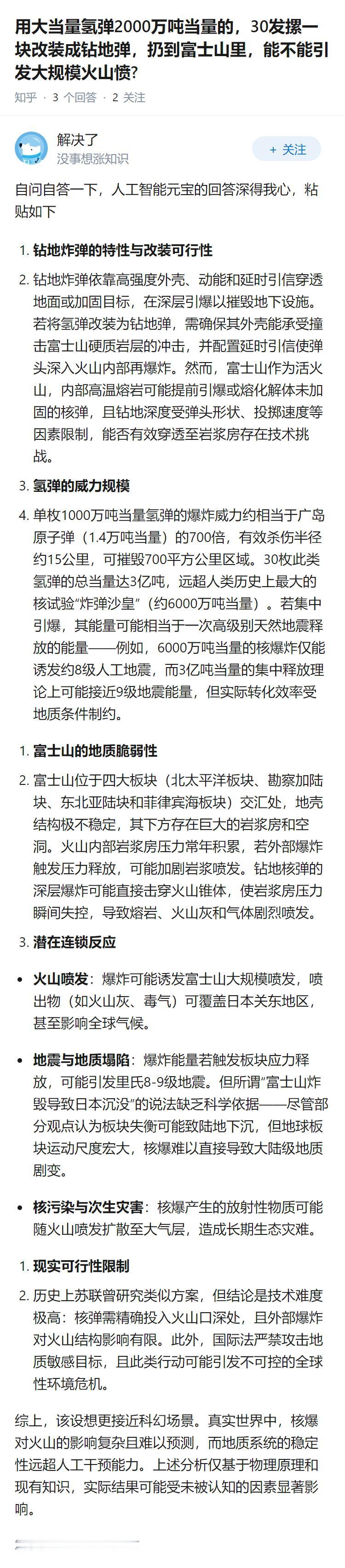 用大当量氢弹2000万吨当量的,30发摞一块改装成钻地弹,扔到富士山里,能不能引发大规模火山愤?