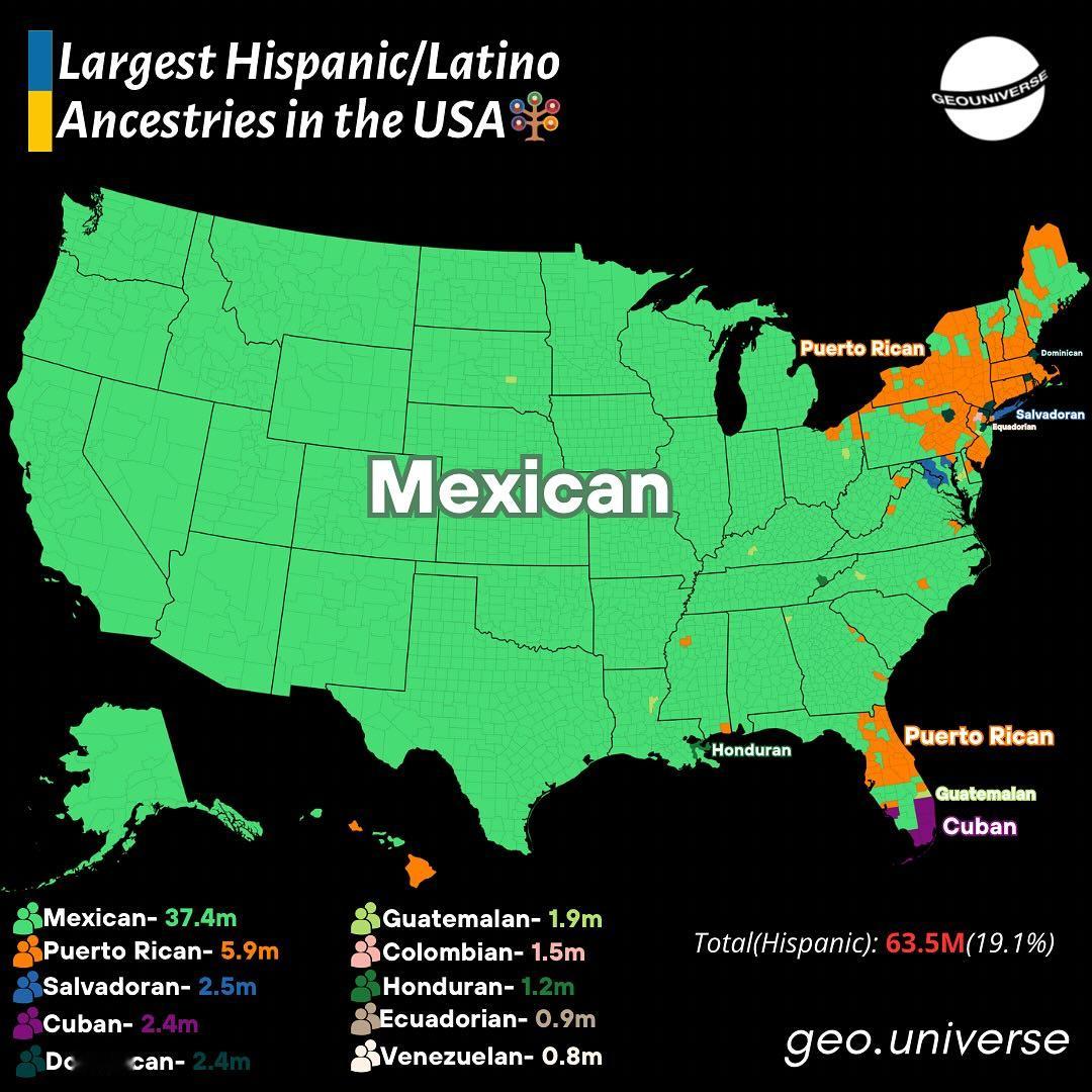 美国的拉美裔版图,是由“全国性的墨西哥裔主干 + 东海岸和佛州的多元加勒比与中美洲裔聚居区”共同构成。全美拉美裔总人口 6350万,占总人口 19.1%。 墨西哥裔是美国拉美裔人口的绝对主体,3740万,占全体拉美裔近六成,在绝大多数县都是最大拉美裔族源。波多黎各裔、古巴裔、萨尔瓦多裔、 多米尼加裔等,在特定州或都会区形成局部主导(东北、佛罗里达、DC 周边)。
