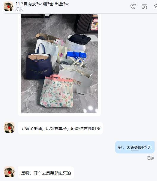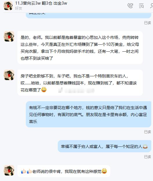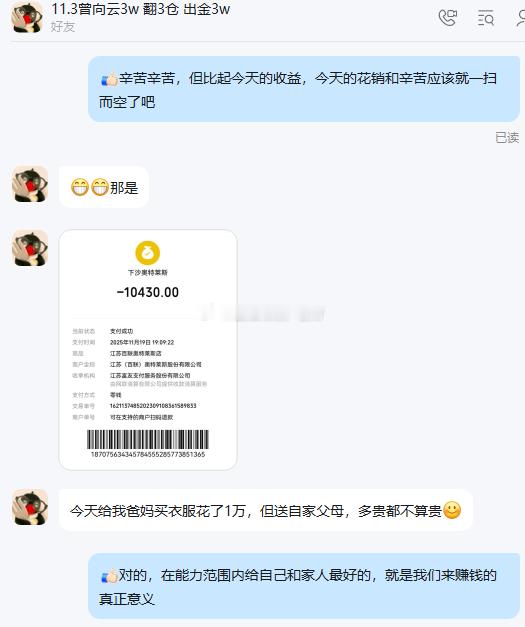 赚钱的意义就是能力所能及的让家人幸福看到我实盘的小云用今天投资赚的钱给家人买礼物,我从心底由衷的开心。你们的行动证明了老方的实力,更表达了自己的心意,同时也说明老方实战团队大家庭是个温馨与和谐的避风港。才能让大家赚到钱。小云上个星期出金的3万本金,今日为父母随随便便就买了1万块钱的衣服。这一切都因为有钱而显的花的云淡风轻。我经常听到一部分朋友说,我也想孝顺啊,那我不得有钱吗,我没钱怎么孝顺。老方反问,那为什么有机会有人愿意带你赚钱的时候,你下意识不是去了解,而是本能的反抗觉得害怕不靠谱,这样你确实不会遇见骗子,但你也错过了赚钱的机会,就像我们外汇市场一样,风险和收入是成正比的!小云近期的操作都是在大家的眼皮子底下进行,一切都以真真实实的方式展现给大家考察。加入我实盘之后想不好还真挺难的。希望大家都去敞开心扉。未来都能有能力在家人需要依靠你的时候,你有那份经济能力和底气让他们依靠,而不是我没钱没办法。正所谓百善孝为先,小云的做法值得我们很多人学习。