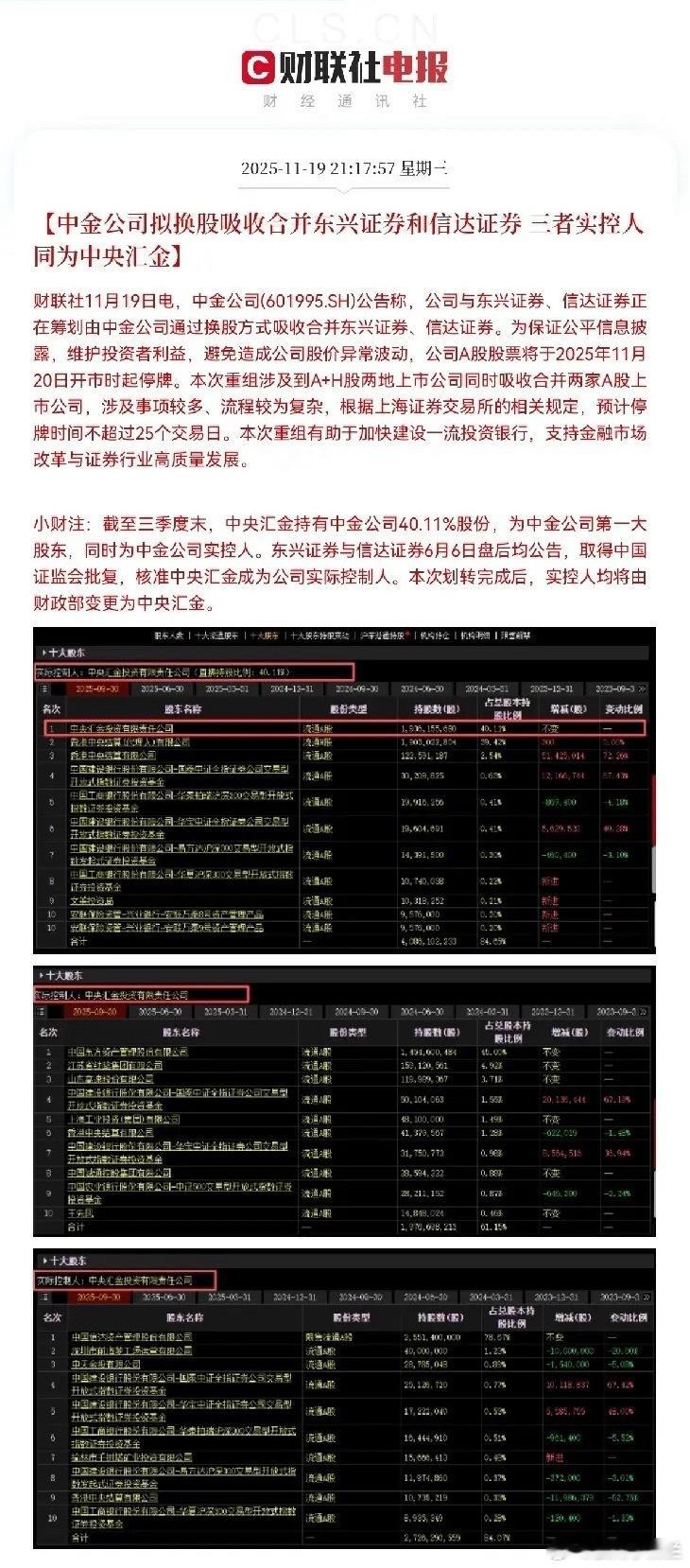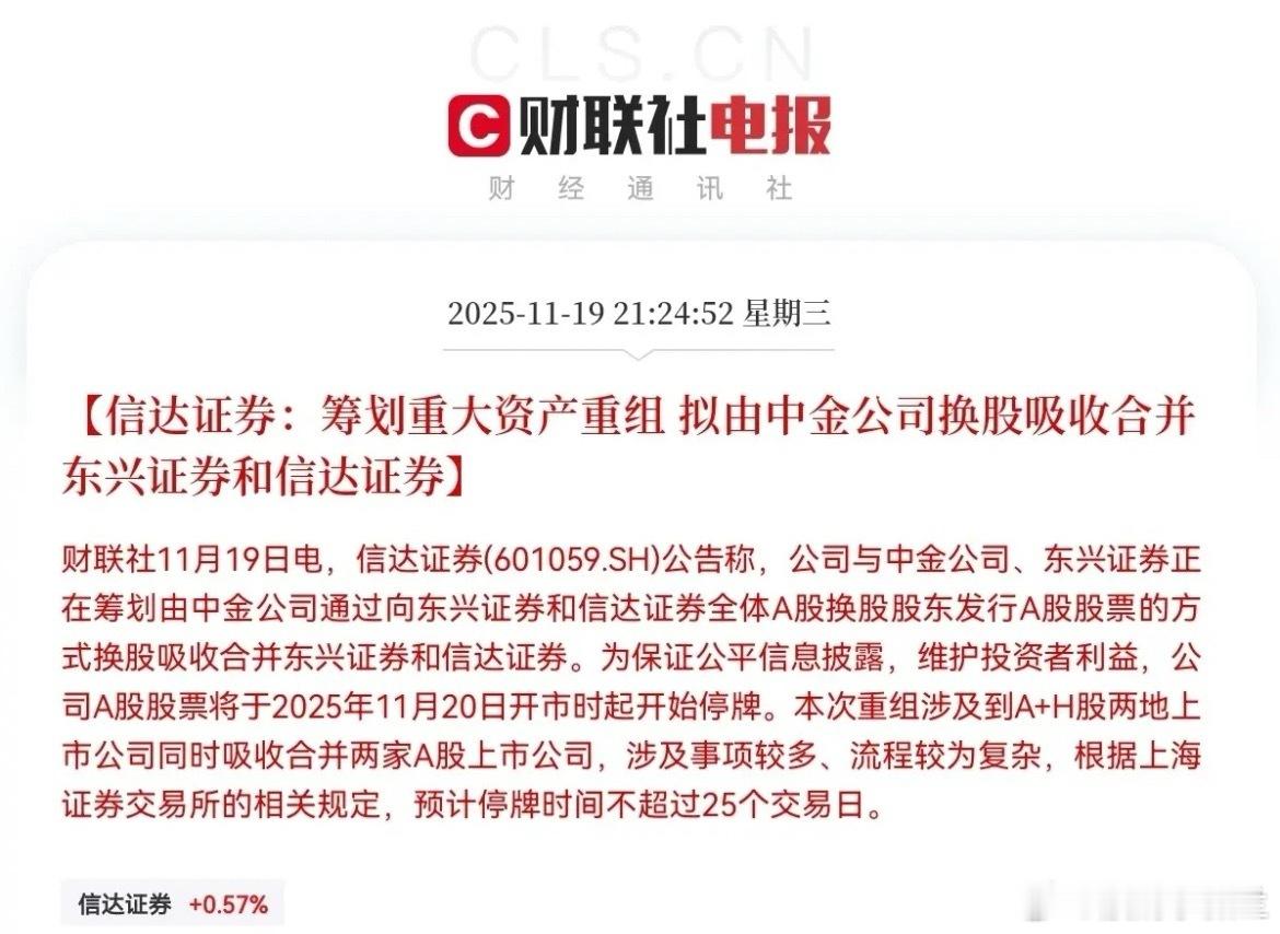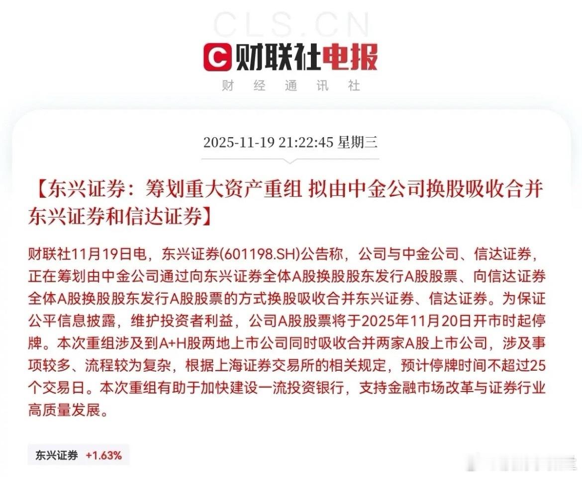 牛市旗手要跳空高走了!证券板块突发重磅利好消息明日证券板块要起飞了,满仓证券板块的,此刻又要兴奋的睡不着了晚间9点17分,中金公司、信达证券、东兴证券三大证券同步发布重磅并购重组公告,由中金公司以换股的方式吸收合并东兴证券和信达证券,三家券商公司都于明日停牌,预计停牌时间不超过25个交易日,此重大利好消息一出,股民们都激情澎湃了,都乐开花了,一致认为证券板块整合预期又开始大升温了,接下来大有可能陆陆续续会有一半以上的证券公司会步入并购重组的步伐,证券行业做大做强之路势不可挡,国际一流证券公司将呼之欲出,这对于整个证券行业来说是重大利好股民们,坐稳扶好,证券板块突发利好消息刺激下,证券板块压了这么久,这会恐怕是压不住了,预计明日牛市旗手大概率要冲锋了,高开高走稳了吧…!