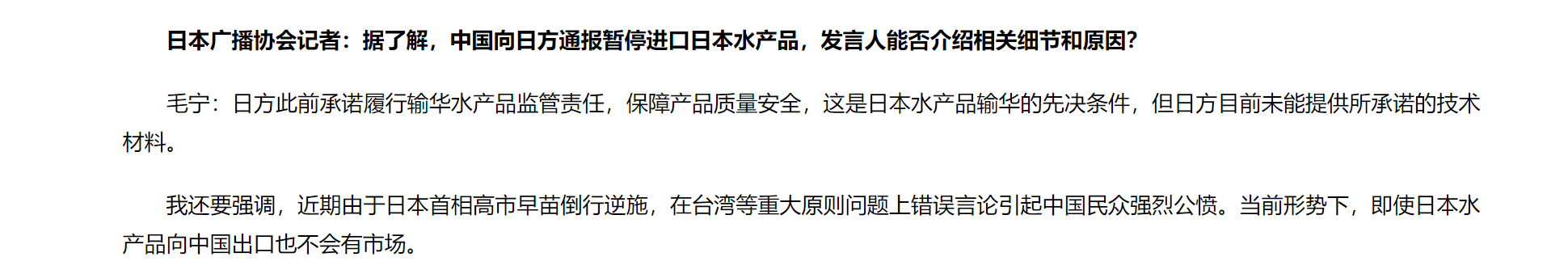 🔻2025年11月19日,外交部发言人毛宁主持例行记者会。🔻日本广播协会记者:据了解,中国向日方通报暂停进口日本水产品,发言人能否介绍相关细节和原因?🔻毛宁:日方此前承诺履行输华水产品监管责任,保障产品质量安全,这是日本水产品输华的先决条件,但日方目前未能提供所承诺的技术材料。我还要强调,近期由于日本首相高市早苗倒行逆施,在台湾等重大原则问题上错误言论引起中国民众强烈公愤。当前形势下,即使日本水产品向中国出口也不会有市场。🔻via 外交部网站