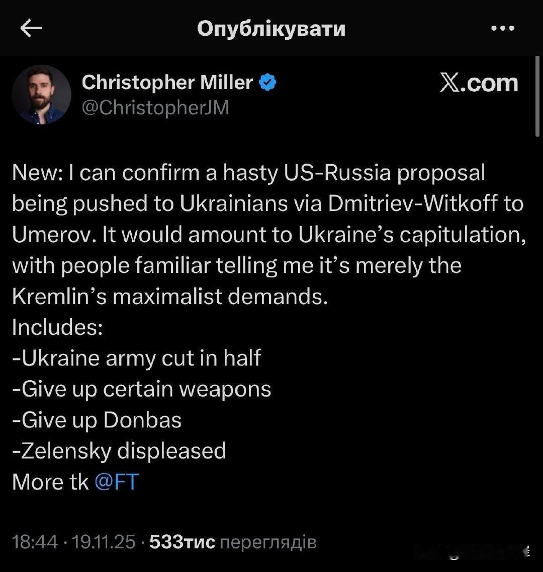 《金融时报》记者透露,美俄两国达成一份仓促的停战提议,并施压乌克兰接受。 “最新消息:我可以确认,美国与俄罗斯正通过Dmitriev和Witkoff向乌克兰方面施压,提出一项仓促的提议,要求转交给Umerov。该提议实际上等同于乌克兰的投降。 据知情人士透露,这不过是克里姆林宫提出的极端要求,内容包括: - 乌克兰军队削减一半 - 放弃某些武器 - 放弃顿巴斯地区 - Zelensky对此感到不满 ”