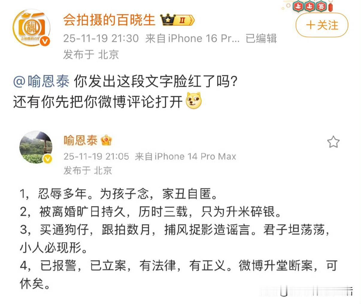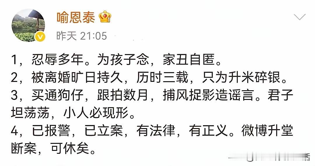 前脚辟谣的声音刚落,后脚就有人出来怒骂他。 看来这一次的喻恩泰遇到大麻烦了,骂他的人不是别人,就是那个当年怒骂姚晨出轨,替凌潇肃出头儿的巨春雷。 这个哥们不知道什么来头?但是经常会出现在明星夫妻离婚闹剧当中主持公道。 他说喻恩泰道貌岸然,早该塌房了。 看来《武林外传》和他相克,前后都被他喷过[捂脸][捂脸] 还有史林子疑似出轨对话当中的男士出来辟谣了,说照片被别人偷用,这到底是哪一出啊?喻恩泰