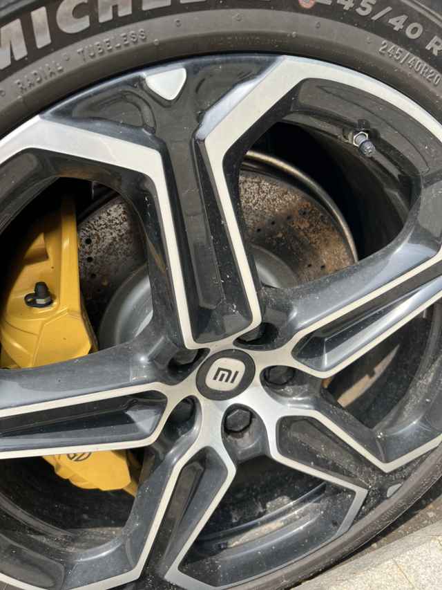 确实生锈了 之前看网上有人说小米su7 的刹车片生锈,今天看了一下,确实生锈。 不过看了一下别家的一些车车,比如福特,大众,看起来也生锈。