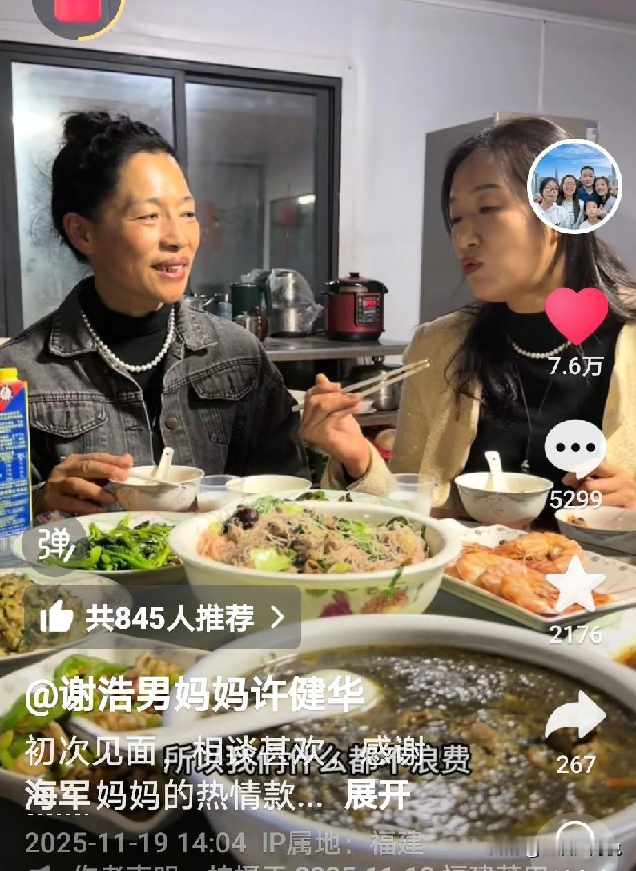 没想到谢浩男妈妈和海军妈妈初次见面的视频这么受欢迎, 点赞量竟然达到7.6万多, 评论5000多,收藏2000多, 看到谢浩男妈妈和海军妈妈见面怎么感觉像是会亲家呢?[捂脸] 而且还看到了谢浩男妈妈给海军妈妈准备了好多礼物,还给海军妈妈买了衣服, 海军妈妈也是做了一桌子丰盛的晚餐回馈她们。 看着她们俩聊的甚来,特别好,如果大妹和海军两家也会错不了的[呲牙]