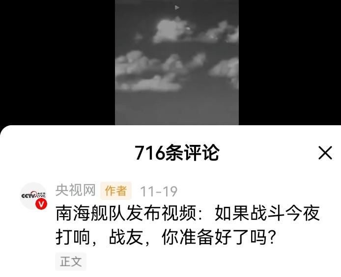 如果战斗今夜打响 战友您准备好了吗? 见到这个题目,任何一位军人,任何一位忠诚于祖国的人民怎能不热血沸腾! 这是昨天南海舰队发布的视频标题。 一位年轻的军人手握钢枪,三声呼唤呐喊 : 我随时准备着! 与战友们同赴疆场! 听从祖国召唤! 网友们的热血同样在沸腾。因为近50岁的中年人是这样说的: 我虽然没当过兵但我知道在民族大义面前在祖国需要的时刻为了后代不遭战乱,我愿挺起脊梁,扛起武器,与所有热血男儿同赴疆场! 另有一位网友的提醒也非常重要: 吸取之前教训,对所有人员进行认真排查筛选做好信息保密,出枪必胜! 更有一条朴实的留言点赞最多: 国家兴亡,匹夫有责。如有召,必立回! 一条视频激起千层浪,让我们再次感受到中华民族最强大的凝聚力,中华人民共和国最强大的感召力!