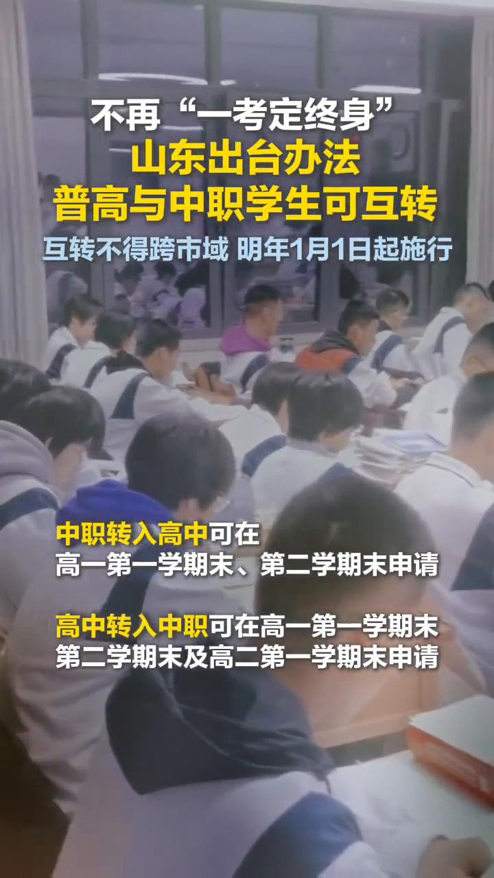 不再"一考定终身",山东出台办法,普高与中职学生可互转。 近日,山东省教育厅正式印发《山东省普通高中和中等职业学校学生互转实施办法》,系统构建普通高中和中职学校学生互转的制度体系。该《办法》将于2022年6月1日起施行。 中职转入高中可在高一第一学期末、第二学期末申请。高中转入中职可在高一第一学期末、第二学期末及高二第一学期末申请。高中转入中职仅限三年制,不得转入五年制和"3+4"贯通培养的中职段。学生须按照转入学校学生身份参加高考报名,享受相应升学政策。