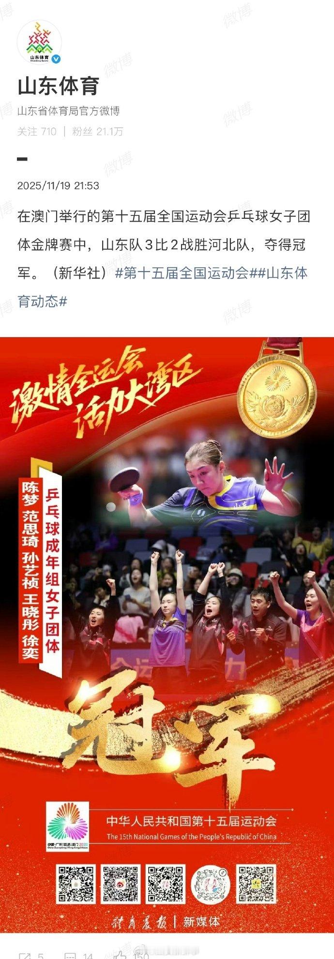 【】11月19日,第十五届全运会乒乓球项目女团决赛,由 领衔 的山东队对阵由 领衔的河北队,最终,山东队3比2战胜河北队,时隔12年再次获得女团冠军。 赛后,山东省体育局第一时间发出夺冠消息。