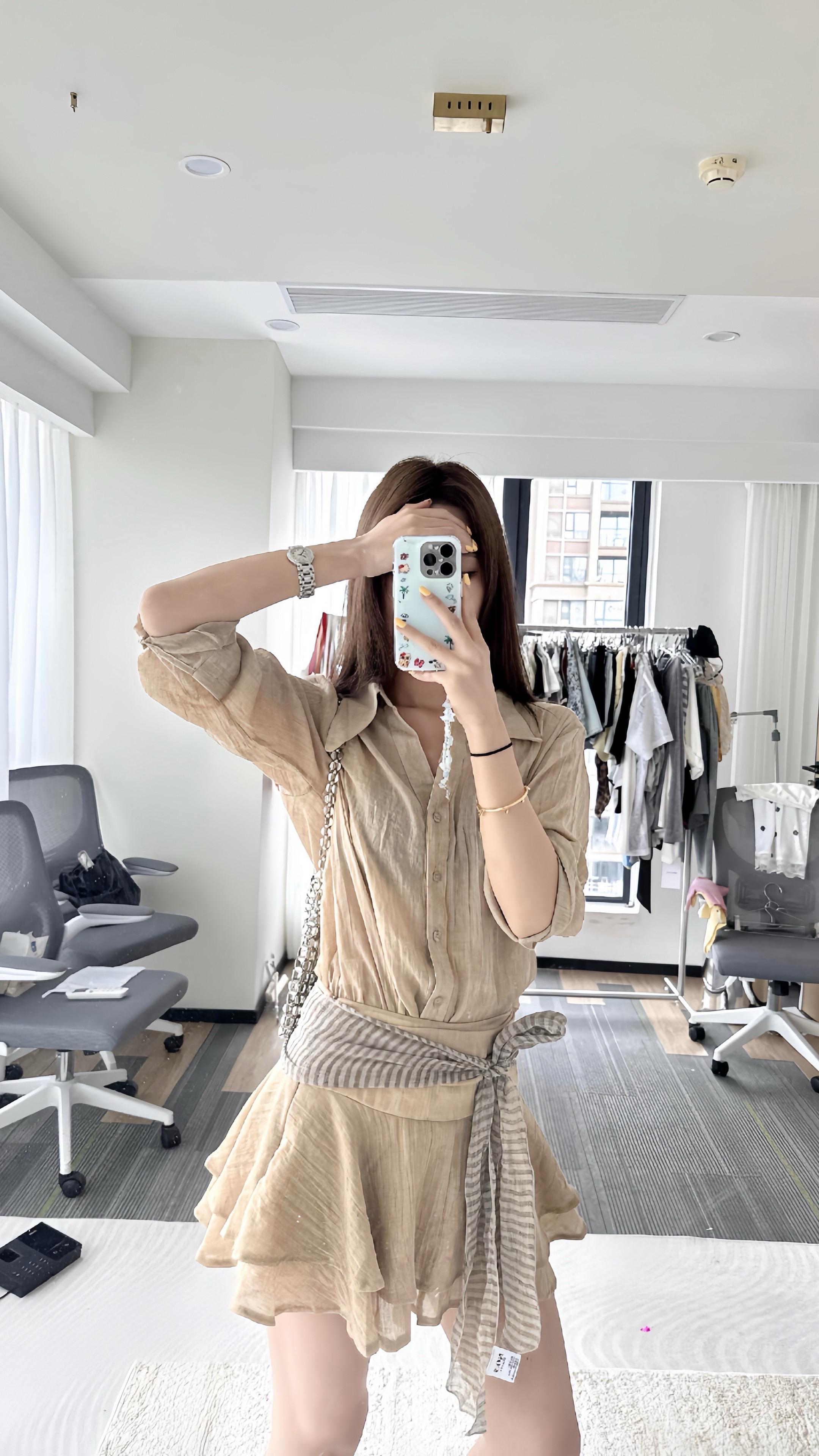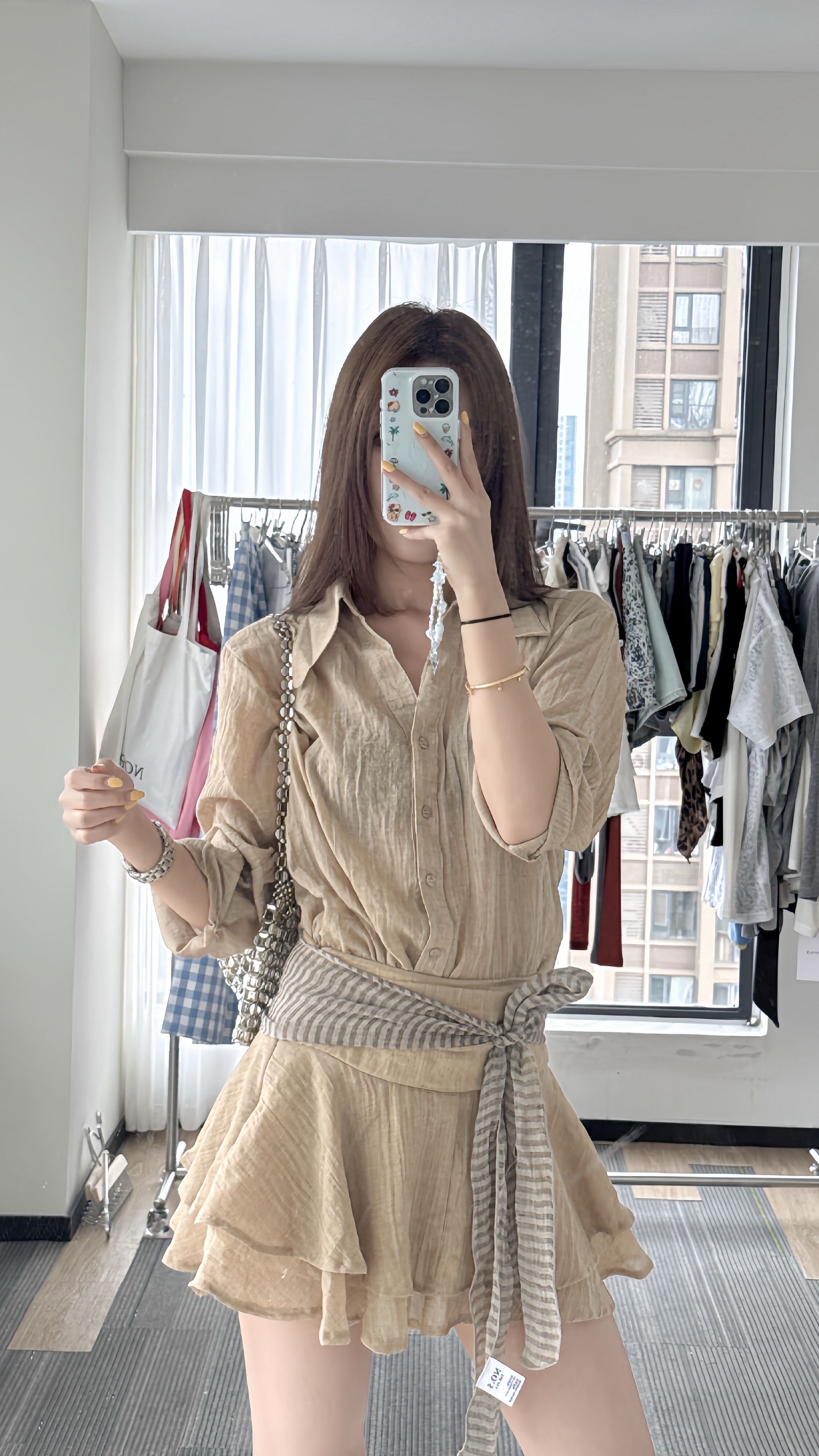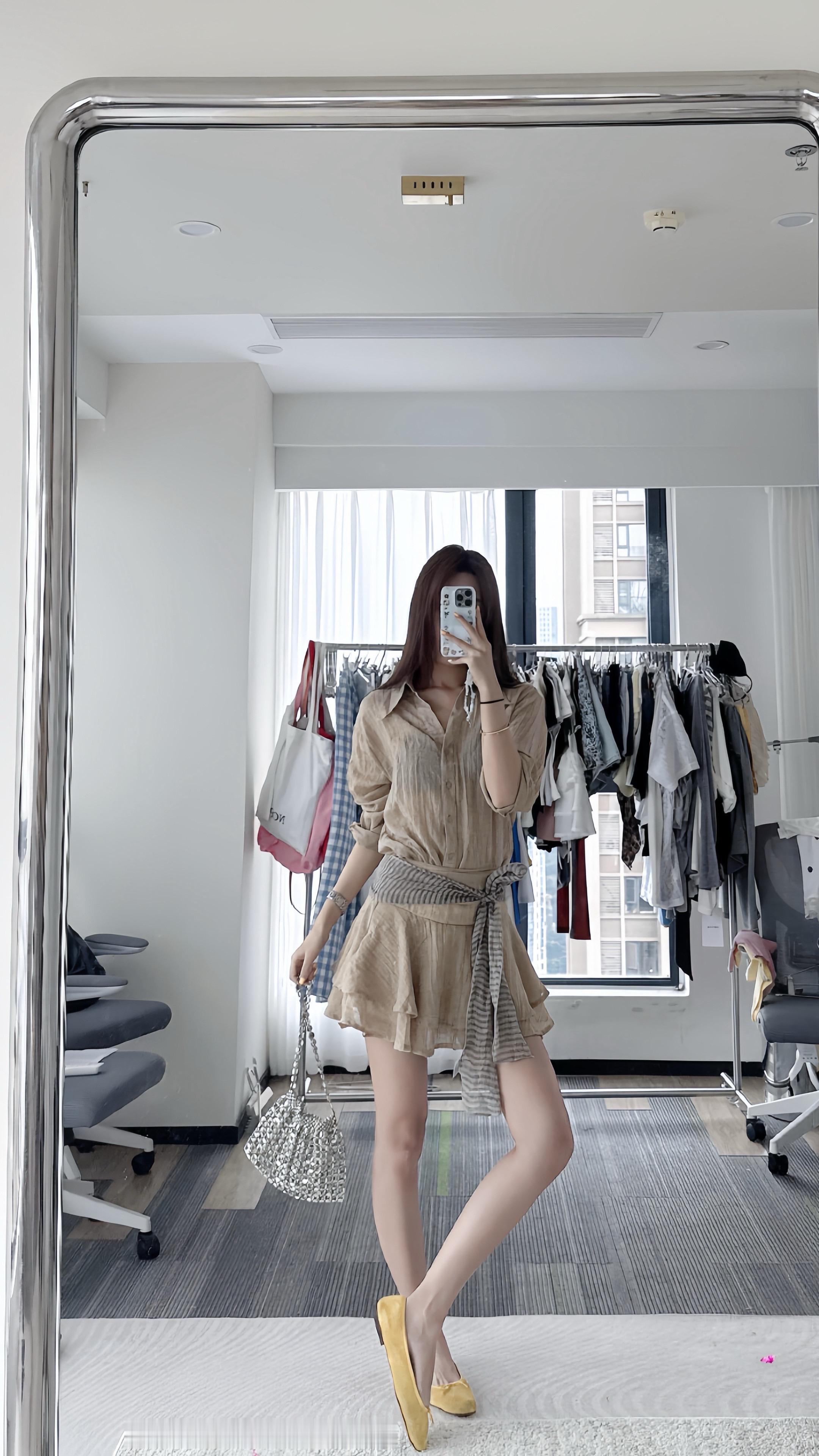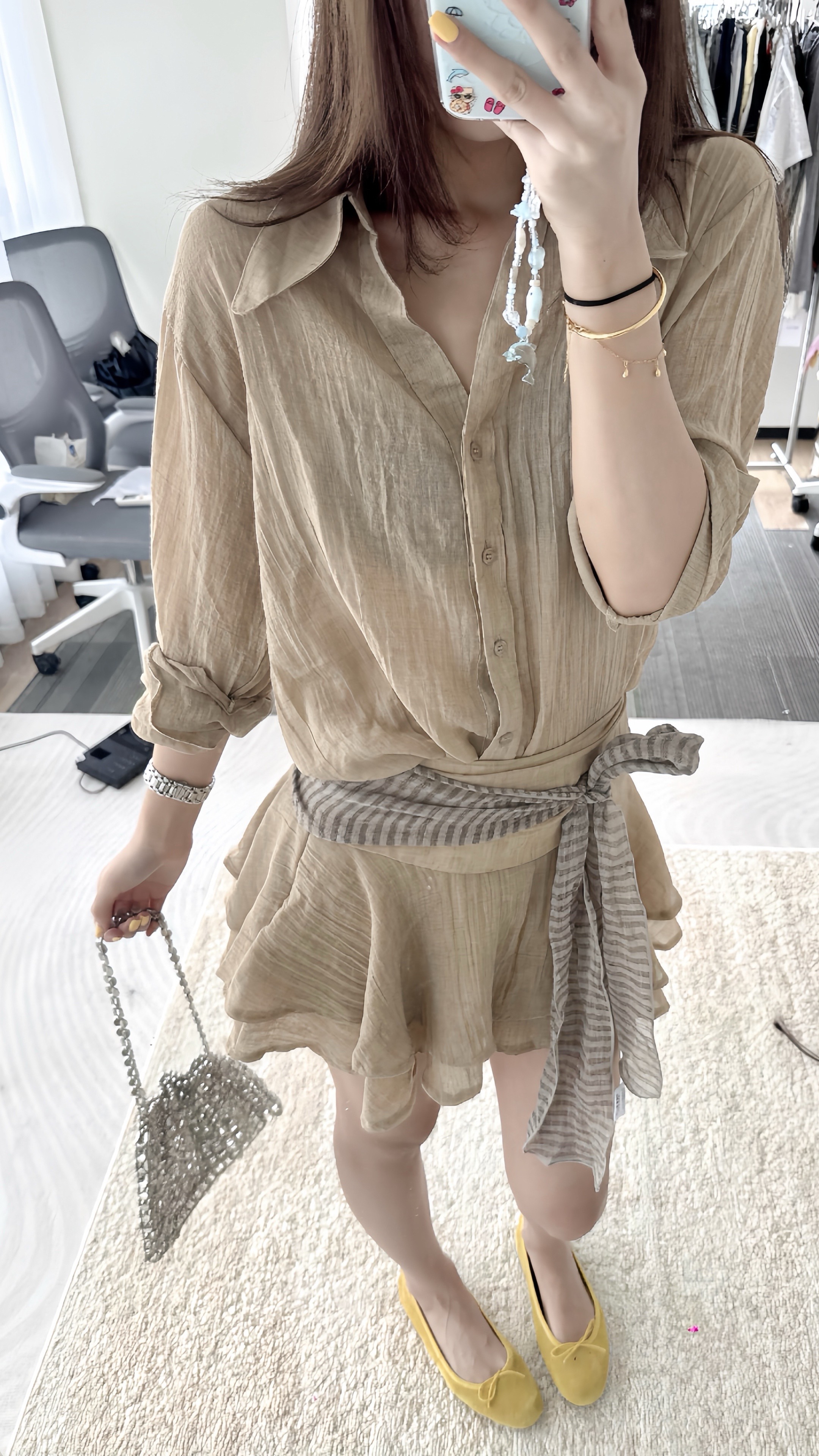 浅绿卡其的颜色真的自带氛围感,衬衫和短裙的搭配兼具通勤和度假气息,化身韩系知性小姐姐。