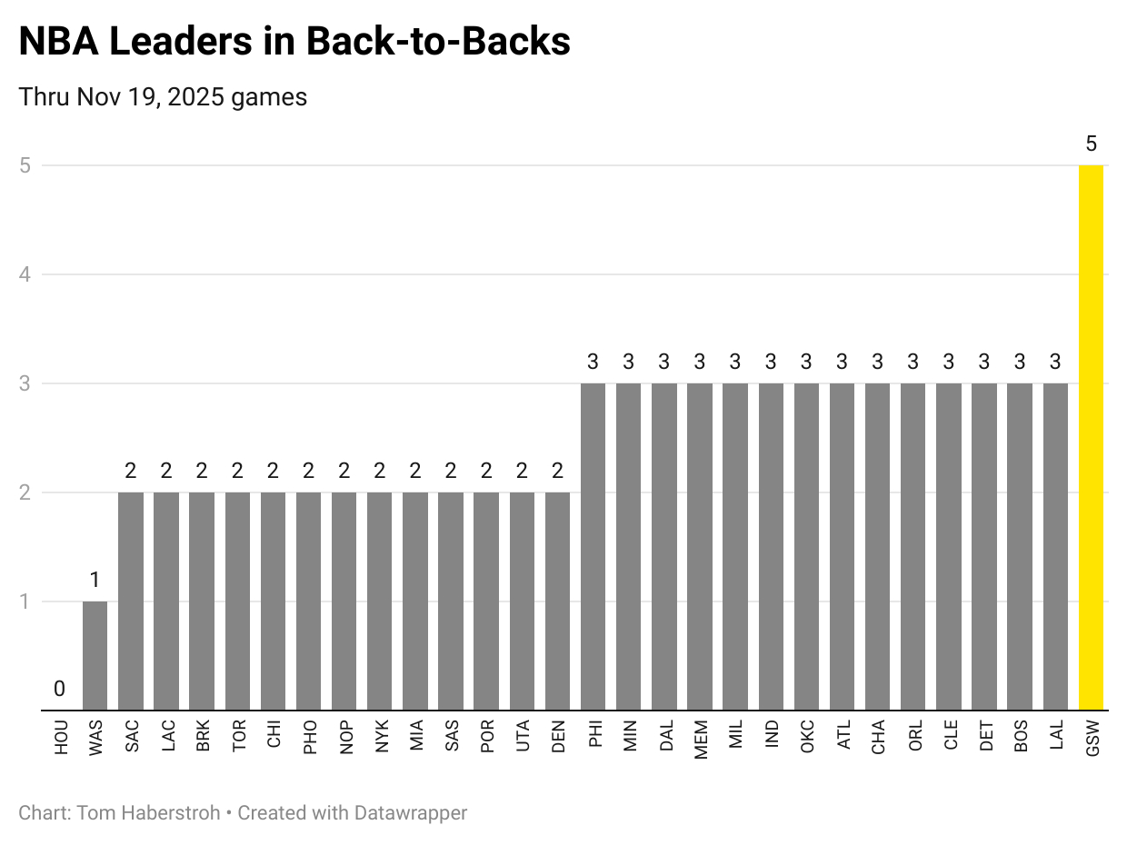 赛季至今联盟各队背靠背次数,勇士最多5次,火箭最少,还没打过背靠背。包括湖人在内的14支球队打过3次背靠背。