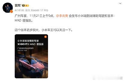雷军说,即将在广州车展发布的新版本“小米HAD增强版”进步很大 等发布会看看雷总怎么说了【来自懂车帝车友圈】