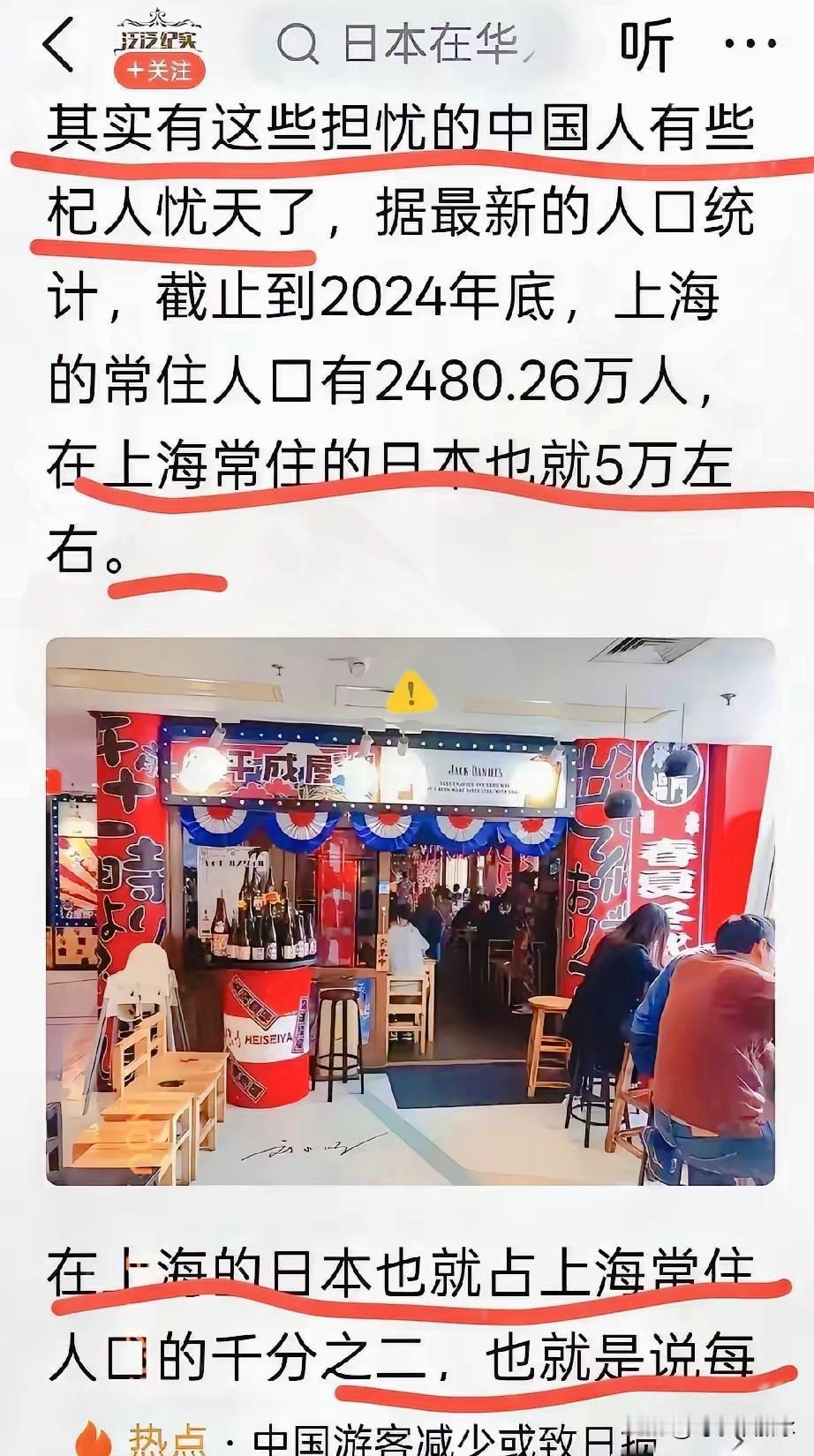 上海有5万日本人定居 他们并不是零星分布在上海各个地方 而是集中在古北、碧云等地区,形成了日籍聚集区。 这些日本人在上海生活了很久,有着完整的生活服务体系,和本地的差异主要体现在饮食、文化等方面。 尽管中日关系一直很紧张,历史上日本侵略东方大国的行为也让人痛心,但这些日本人并没有选择离开,而是安家落户在上海。 5万又不是5个,数字问题并不能说明问题。 定居的外籍人士,有可能被某些势力利用,造成更大的安全隐患。 管理部门不能因为某些外籍人士的到来而关闭国门,但也不能放任自流,而是要加强对外籍人口的动态监测与安全审查,以达到开放与管理的平衡。日本人 上海外国人 上海日本旅游 上海人口 上海老外聚集地 上海人口分布 上海人移民日本
