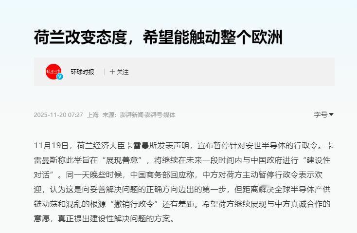 11月19日,荷兰公开对中方服软,声明中有一句话特别有意思! 当天,荷兰经济事务与气候政策大臣米歇尔·卡雷曼斯发布了一则简短但意味深长的声明:荷兰政府决定“暂停对安世半导体的干预”。这句话看似平淡,但紧随其后的一句解释却耐人寻味——“鉴于近期的事态发展,我认为现在是采取建设性步骤的正确时机。” 安世半导体可不是普通公司,前身为荷兰飞利浦的半导体部门,在全球车规级芯片领域是实打实的巨头。 2019年中国闻泰科技花330亿元全资收购它,这笔交易完全合法合规,之后安世就成了闻泰的“利润担当”,2025年上半年贡献的净利润占比居然高达266%。 更关键的是,这些年安世的核心产能早就向中国转移了,广东东莞的工厂承担着全球70%的芯片组装检测工作,荷兰本土业务只剩15%,还不涉及任何敏感技术。 就是这样一家中资控股、中国产能占主导的企业,荷兰居然在9月30日用1952年冷战时期的《货物可用性法案》强行接管,美其名曰“维护国家经济安全”,说白了就是在美国施压下搞的强盗行为。 荷兰以为抢了就没事?太天真了!中方的反制来得又快又准,4天后商务部就宣布对安世实施出口管制,禁止其在华子公司出口成品芯片。 这一下就击中了要害——全球每四辆汽车里就有一辆用的是安世芯片,而东莞工厂是最大的出货源头。欧洲车企最先扛不住,德国汽车工业协会的数据显示,德国车企对安世芯片的依赖度高达68%,每三辆德国车里就有两辆用这个牌子。 禁令刚下没几天,大众沃尔夫斯堡工厂的两条新能源生产线就停工了,每天直接损失超过1亿欧元;宝马慕尼黑工厂的高端车型交付时间从3个月拖到6个月,订单丢了一大堆。 德国车企急得跳脚,转头就把荷兰骂惨了,欧洲汽车制造商协会更是直接警告:再解决不了芯片断供,欧洲汽车厂几周内就得全停。 荷兰这时候才发现自己成了众矢之的,一边要配合美国的打压政策,一边要面对德国、意大利这些汽车大国的施压,欧盟内部的对华政策分歧一下就暴露了。更让荷兰头疼的是,中方还亮出了稀土这张牌,宣布对稀土及相关技术实施出口管制。 要知道荷兰的ASML公司是全球光刻机巨头,而稀土是制造光刻机的关键材料,ASML根本离不开中国的稀土供应。这两下组合拳打出去,荷兰彻底慌了神。 其实荷兰心里比谁都清楚,跟中国对着干没好果子吃。中荷双边贸易额连续4年都超过千亿美元,农业、水利、高科技这些领域的合作早就深度绑定了。 就说ASML,虽然一直受美国限制不能向中国出口最先进的光刻机,但中低端设备和零部件的对华出口一直是其重要营收来源。而且荷兰的农产品、化工产品也大量依赖中国市场,真要是闹僵了,受损的绝不止是半导体行业。 5月份王毅外长和荷兰外交大臣会谈时就明确说了,希望荷方为中国企业提供公平环境,当时双方还达成共识要就半导体合作保持沟通,可惜荷兰当时没听进去,非要跟着美国一条道走到黑。 反观德国的教训就在眼前,之前跟着美国搞技术限制,结果芯片供应链断裂,汽车工厂纷纷停工,德媒还嘴硬说“把中国想得太好了”,可明眼人都知道,是他们自己过度依赖中国市场又不愿构建合理供应链,最后自食恶果。 荷兰可不想重蹈覆辙,尤其是现在还是看守内阁,根本经不起经济动荡。安世被接管后,荷兰本土几百个岗位保不住,员工纷纷离职,业务停摆的损失每天都在增加。内外压力之下,荷兰终于扛不住了,才有了11月19日那句“暂停干预”的服软声明。 说来说去,荷兰这次服软根本不是什么“建设性步骤”,就是利益权衡后的必然选择。他们终于看清了,中国不是任人拿捏的软柿子,现在的中国有足够的实力维护自身利益,更有能力让挑衅者付出代价。 而且全球产业链早就深度融合,中国是120多个国家和地区的最大贸易伙伴,想在损害中国利益的同时保全自己,根本就是痴心妄想。 当然,我们也得保持警惕,荷兰只是“暂停干预”,背后还有美国的影子,后续还得盯着他们把承诺落到实处。但不管怎么说,这次事件再次证明:谁跟中国搞对抗,最终只会搬起石头砸自己的脚!