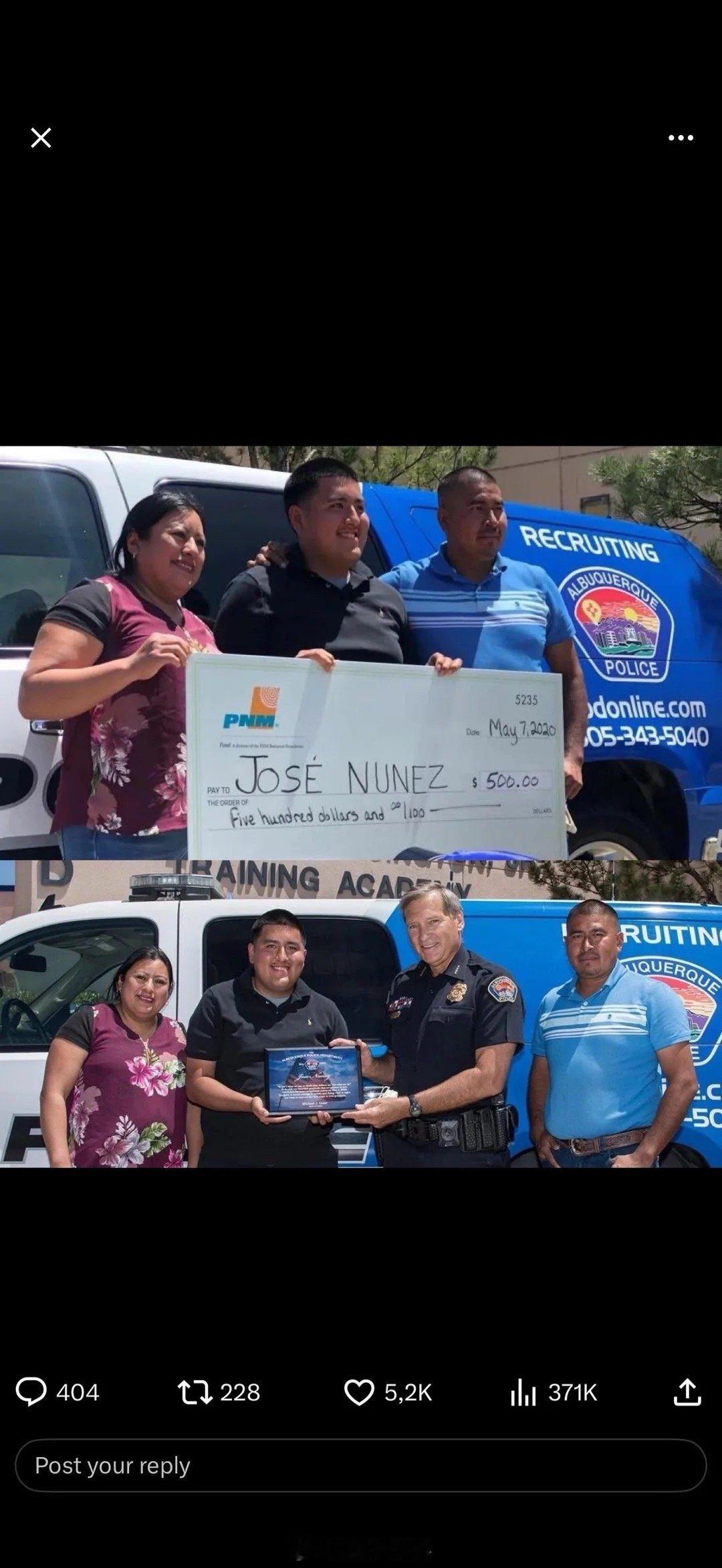 2020年5月3日,19岁的José Nuñez Romaniz在新墨西哥州阿尔伯克基市的一台富国银行ATM机旁发现了一个装有13.5万美元现金的透明塑料袋。他立即报警,警察赶到后清点发现总共是13.5万美元。他是个墨西哥移民孩子,父母都在当地农场收洋葱。媒体报道之后,市长和警长亲自接见了他,当地企业奖励了他500美元的支票。———————不知道他是否看过no country for old man.不拿来历不明的钱,平安就是福。