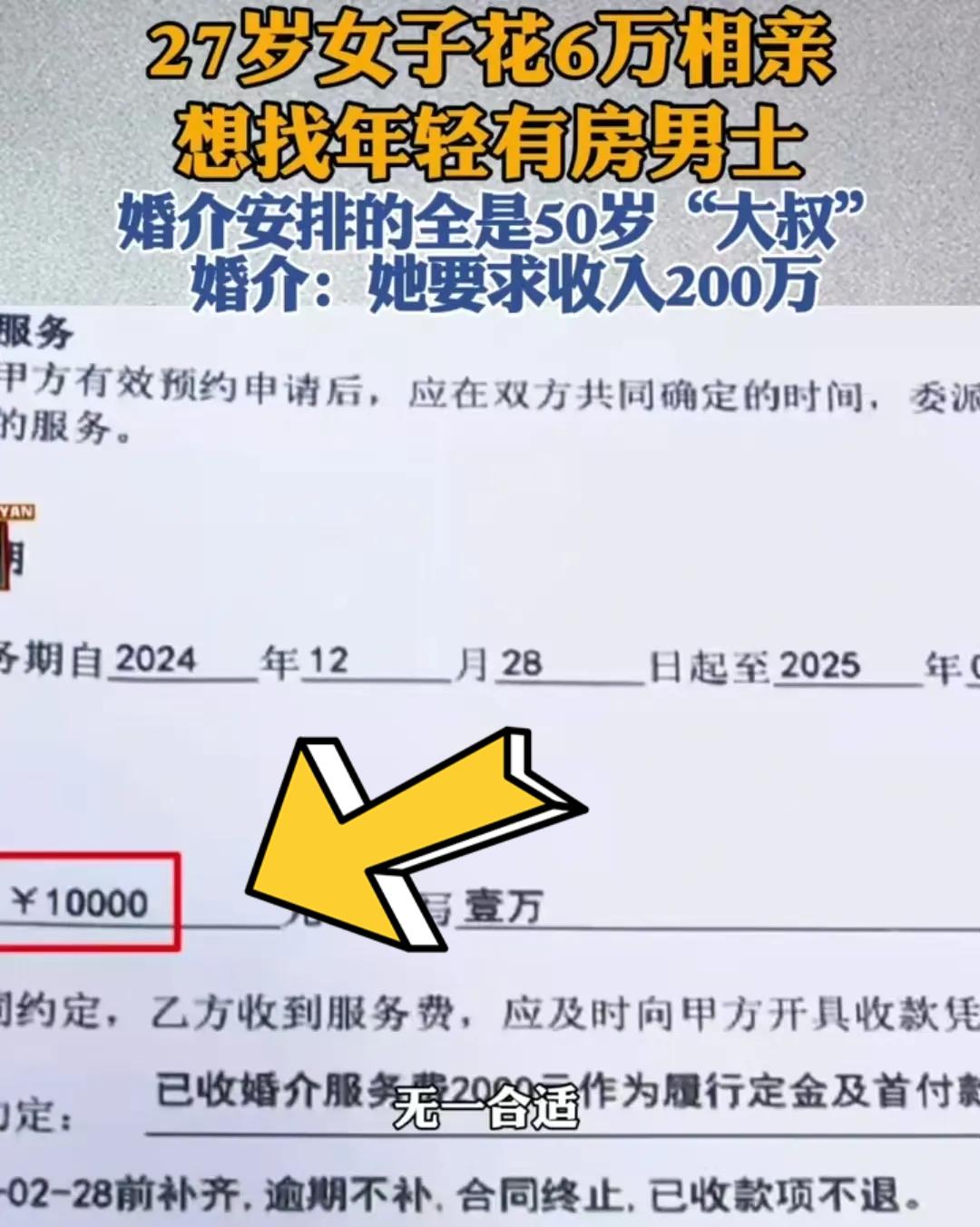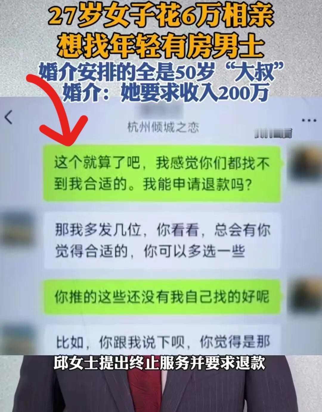 杭州27岁女子砸6万相亲,想找37岁内年入200万的年轻优质男,结果全是四五十岁“大叔”,这操作笑不活了! 去年先交1万见3人全不达标,今年又被忽悠追加5万,没想到还是离异年长男士,有人竟说“生过孩子更放心”。 婚介喊冤,年轻高收入男堪比“熊猫”稀有。网友笑称这是“6万撬动200万的魔幻投资”,婚介画饼比做饼在行。 婚姻哪是用钱匹配的买卖,这场闹剧活像一面哈哈镜,照见不切实际的幻想和套路满满的生意经!
