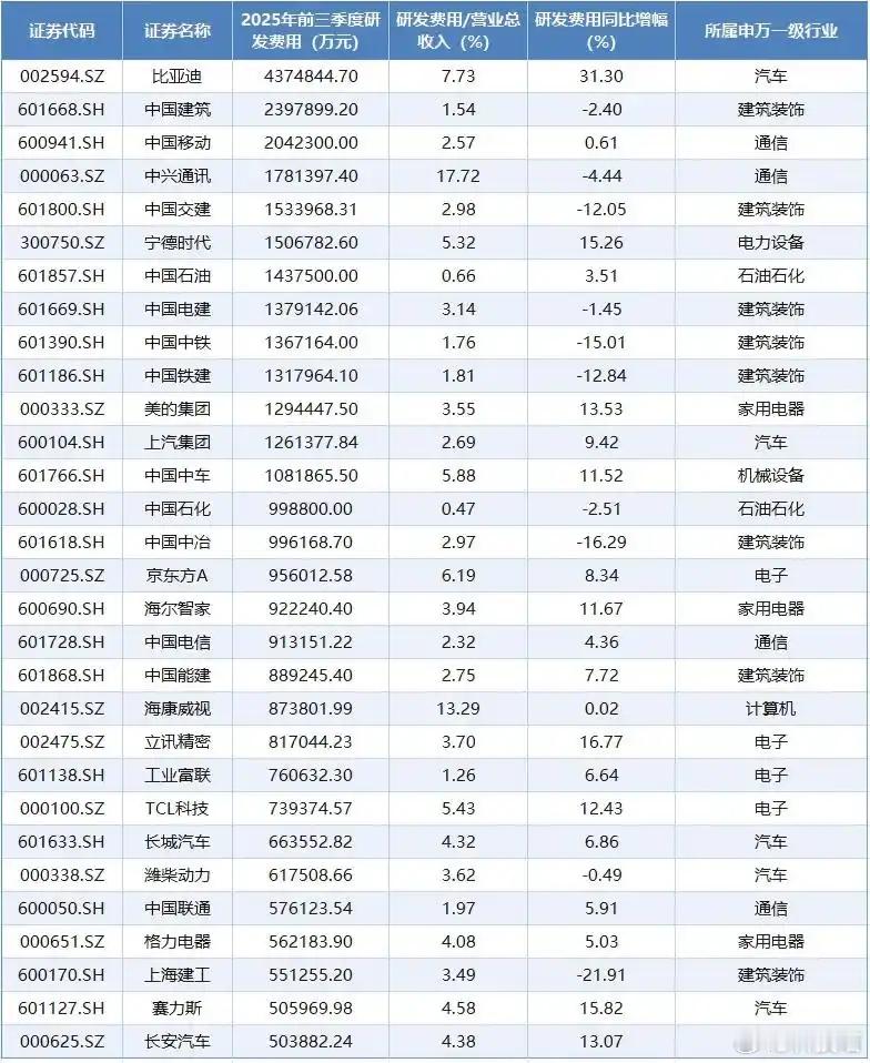 2025年前三季度A股上市公司研发排行榜1,比亚迪3,中国移动4,中兴11,美的12,上汽16,京东方17,海尔智家18,中国电信23,TCL24,长城汽车26,中国联通27,格力电器29,赛力斯30,长安汽车