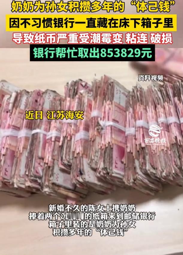 差点好心办坏事!江苏海安,一位奶奶疼爱孙女,多年攒下85万多的“体己钱”,一直放在床底的箱子里面,就等着孙女出嫁的时候给她,可没想到,真要给的时候,却发现这些钱已经受潮霉变,最后孙女带着奶奶一起来到银行进行兑换。   江苏海安,小陈新婚没几天,奶奶就拽着她往屋里走,挪开床板搬出两个铁箱子,锁头锈得得使劲拧才开。   箱子掀开的瞬间,小陈鼻子一皱,潮味儿裹着霉味冲出来,里面一沓沓百元大钞全粘成了硬块,绿霉斑把红色染得斑斑驳驳,指尖一碰就掉渣。   “这是给你攒的体己钱,”奶奶搓着手笑,眼里全是得意,这85万不是大风刮来的,是老人从年轻时干农活、捡破烂开始,一分一毛抠出来的。   儿女给的生活费她舍不得花,卖菜的零钱当天就塞进铁盒,总说“钱攥手里才踏实,银行的数字摸不着”,一藏就是十年,就等孙女出嫁这天给个惊喜。   可南方的潮气没饶过这笔心意,有的钞票粘得像块砖,硬掰就碎成渣;有的边角被老鼠啃出豁口,霉斑把水印都盖严实了,小陈看着奶奶渐渐垮下去的嘴角,赶紧找了块布把箱子裹紧,往邮储银行吉庆营业所跑。   银行工作人员一看这箱子,立马辟了个专区,几个老员工戴上手套口罩,镊子、放大镜、吹风机全用上了。   但是钱太潮了,于是先放恒温恒湿的房间“醒”着,等潮气散点再一张张分离,粘连的不能硬撕,就用棉签蘸温水慢慢润;破得厉害的,得对着光拼图案、对编号,确认是真币才算数。   奶奶坐在旁边急得直念叨,工作人员一边擦霉点一边安慰,中午还端来热饭和姜茶,轮着班干没歇气。   从早上九点多到下午三点多,六个多小时过去,终于数清了是853829元,几乎一分没少。   崭新的钞票叠得整整齐齐,装进红信封递过来时,奶奶的眼泪一下掉下来,攥着工作人员的手不肯放,小陈当场红了眼,这哪是钱,是奶奶攒在床底的十年惦记。   这事传开,好多人说自家老人也有藏钱的毛病,有的藏米缸被虫蛀,有的藏墙缝被雨水泡,哪有这么幸运能全兑回来。   其实老人不是固执,是过惯了苦日子,总把现金当定心丸,可现金藏家里,潮、虫、老鼠都是隐患,放银行不光安全,一年还能多拿些利息,就像这次,要是霉得再厉害点,图案都看不清,按规定可换不回全额。   奶奶的疼爱没白费,银行的细心也暖了心,只是下次再攒心意,不如直接存进银行,让这份爱安安稳稳等着开花,别再让潮气偷了去。