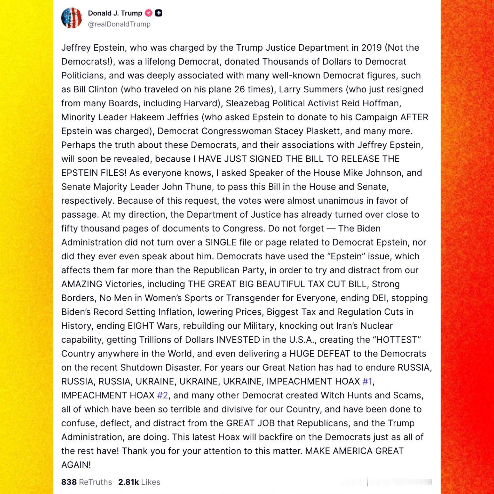 🚨特朗普发文表示,他已正式签署法案,公布爱泼斯坦的档案!