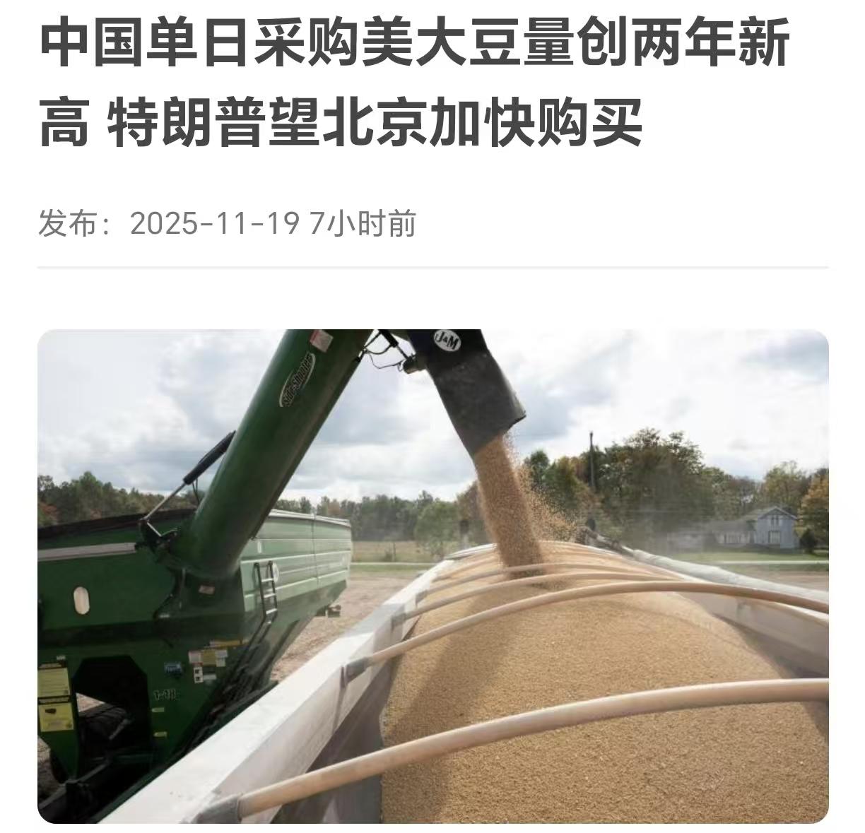 特朗普笑逐颜开 这次中日关系所发生的波云诡谲般的跌宕起伏,虽然隐隐约约有美国的影子,但是起码特朗普还留有“口德”,没有给予高市早苗正面和积极的支持,反而暗讽日本作为盟友在贸易上“坑害”美国。 这背后大概率是特朗普看到中国已经拿出实际行动在大批量采购美国大豆了。 据彭博社报道,自10月初以来,中国采购美豆总量已超过100万吨。计划未来三年内采购量可能逾2500万吨。 怪不得特朗普的心花怒放之情溢于言表,“我们与中国的关系十分良好。”